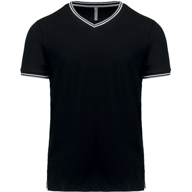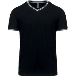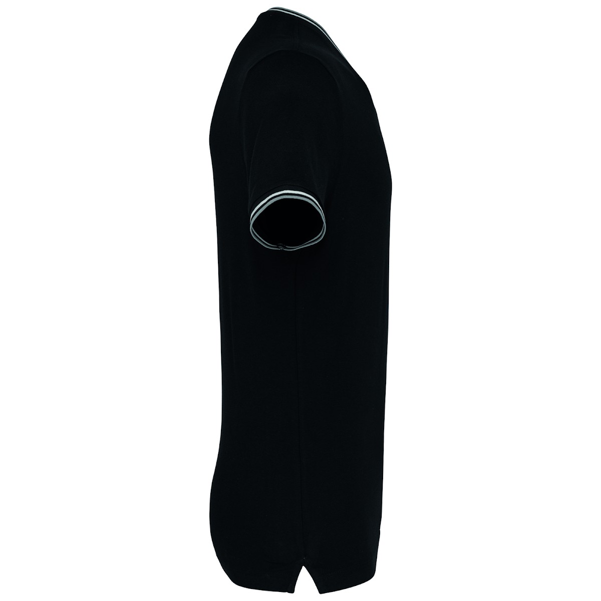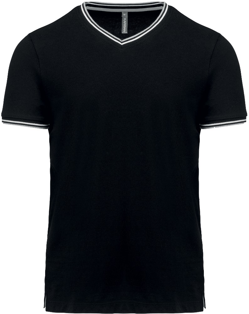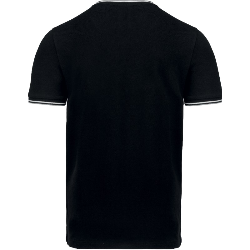 100% coton (90% coton / 10% viscose pour coloris chiné). Maille piquée en coton peigné. Finitions bord-côte avec rayures contrastées au col et bas de manches. Bande de propreté encolure et fentes latérales contrastées. Finition double aiguille au bas du vêtement.