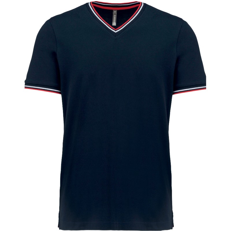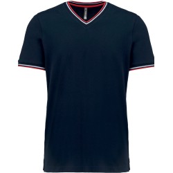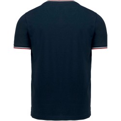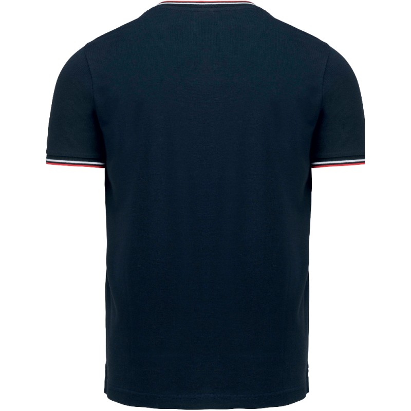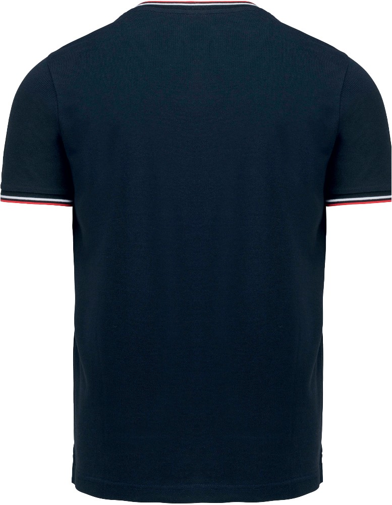 100% coton (90% coton / 10% viscose pour coloris chiné). Maille piquée en coton peigné. Finitions bord-côte avec rayures contrastées au col et bas de manches. Bande de propreté encolure et fentes latérales contrastées. Finition double aiguille au bas du vêtement.