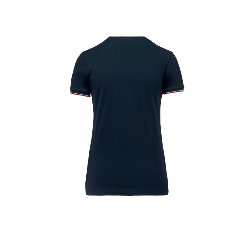 100% coton (90% coton / 10% viscose pour coloris chiné). Maille piquée en coton peigné. Finitions bord-côte avec rayures contrastées au col et bas de manches. Bande de propreté encolure et fentes latérales contrastées. Finition double aiguille au bas du vêtement.