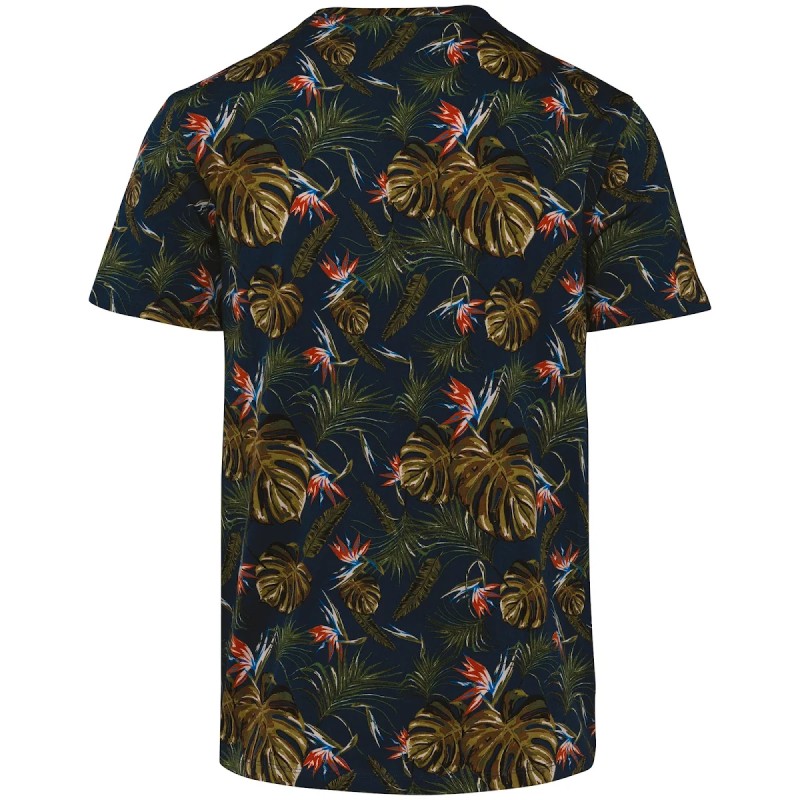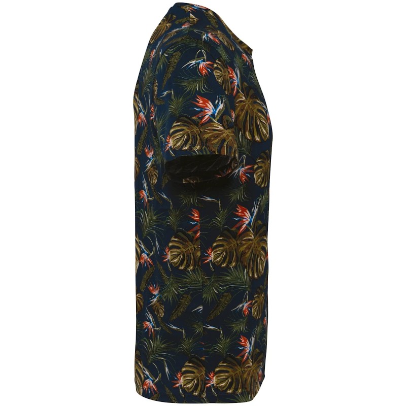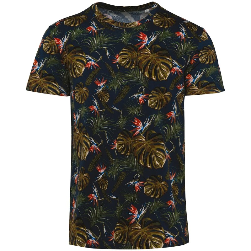 100% coton biologique.  Coton peigné.  Coupe ajustée.  Coutures latérales.  Lavé aux enzymes.  Maille aux motifs imprimés continus.  Encolure et finition bande de propreté intérieure en matière principale.  Finition double surpiqûre bas de manches et bas de vêtement.  Renfort épaule en matière principale.