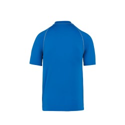 88% polyester / 12% élasthanne. Maille extensible. Protection UV 40+ conforme aux exigences de la norme EN13758-1&2. Manches courtes. Col montant. Coupe très près du corps. Boucle élastique insérée dans l'ourlet devant permettant de passer le cordon du short afin de stabiliser le t-shirt. Surpiqûres contrastées. Finition double aiguilles aux manches et bas de vêtement.