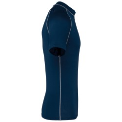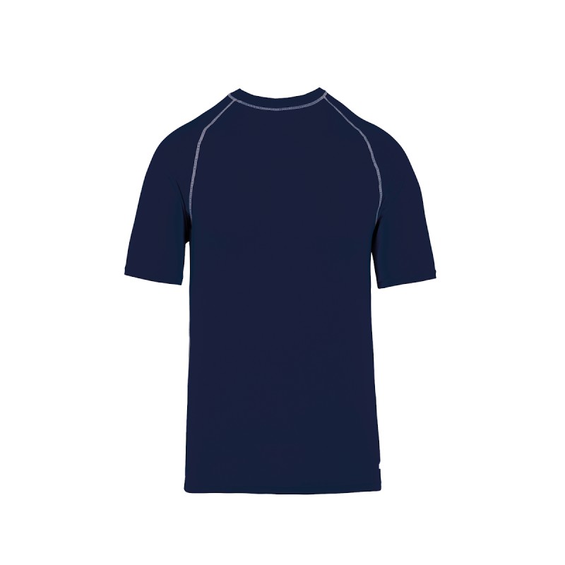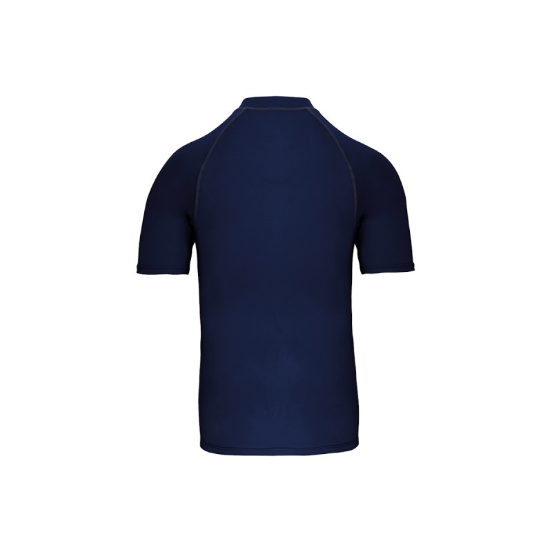 88% polyester / 12% élasthanne. Maille extensible. Protection UV 40+ conforme aux exigences de la norme EN13758-1&2. Manches courtes. Col montant. Coupe très près du corps. Boucle élastique insérée dans l'ourlet devant permettant de passer le cordon du short afin de stabiliser le t-shirt. Surpiqûres contrastées. Finition double aiguilles aux manches et bas de vêtement.