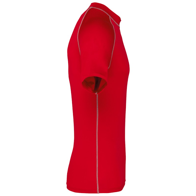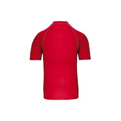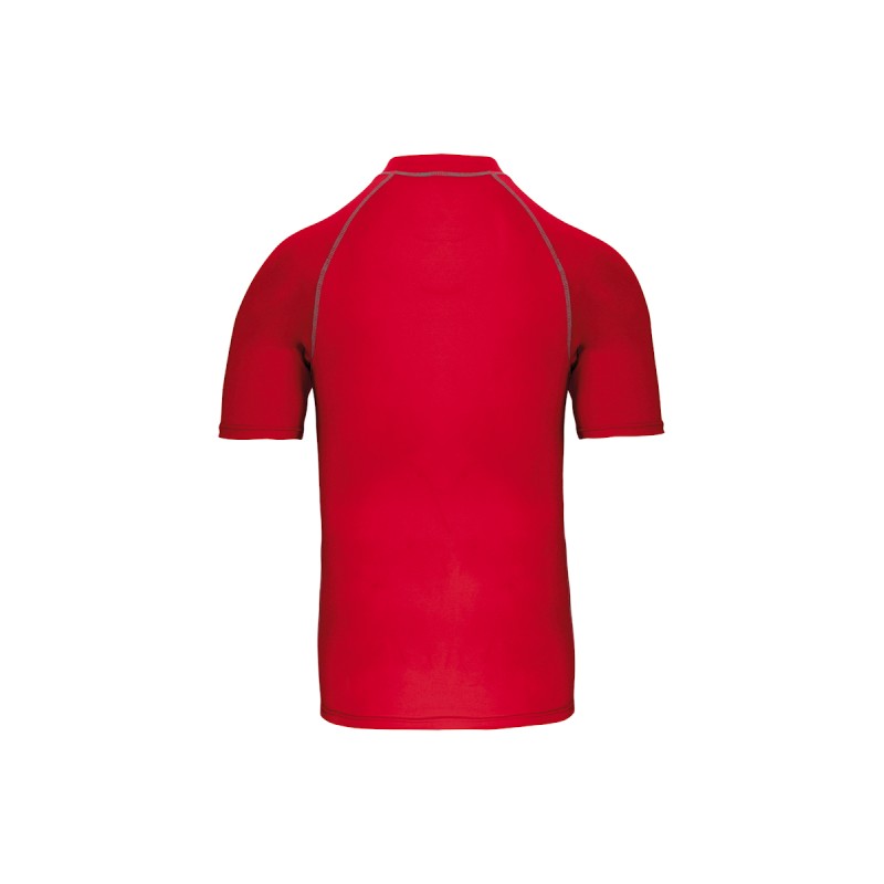 88% polyester / 12% élasthanne. Maille extensible. Protection UV 40+ conforme aux exigences de la norme EN13758-1&2. Manches courtes. Col montant. Coupe très près du corps. Boucle élastique insérée dans l'ourlet devant permettant de passer le cordon du short afin de stabiliser le t-shirt. Surpiqûres contrastées. Finition double aiguilles aux manches et bas de vêtement.