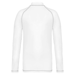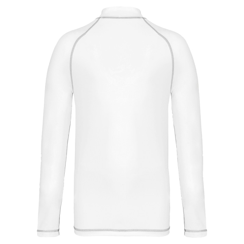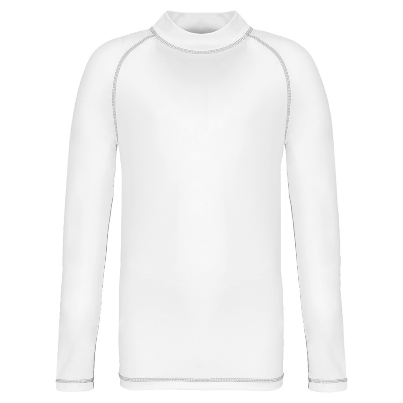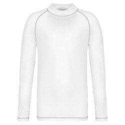 88% polyester recyclé / 12% élasthanne. Maille extensible. Coupe skinny. Protection UV50+ correspondant à la norme EN13758-1&2. Manches longues raglan avec surpiqûres contrastées. Col montant. Boucle élastique insérée dans l'ourlet devant permettant de passer le cordon du short afin de stabiliser le t-shirt. Finition double aiguilles aux manches et bas de vêtement. Etiquette de marque déchirable pour faciliter la personnalisation.
