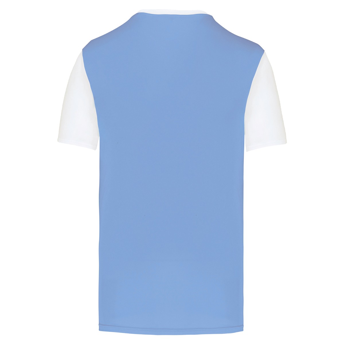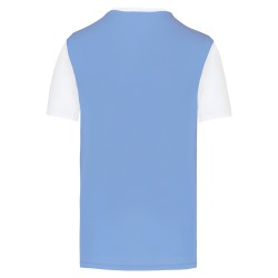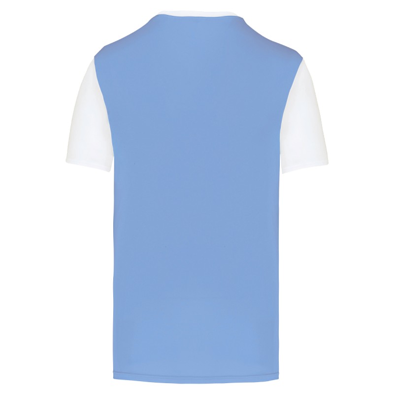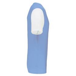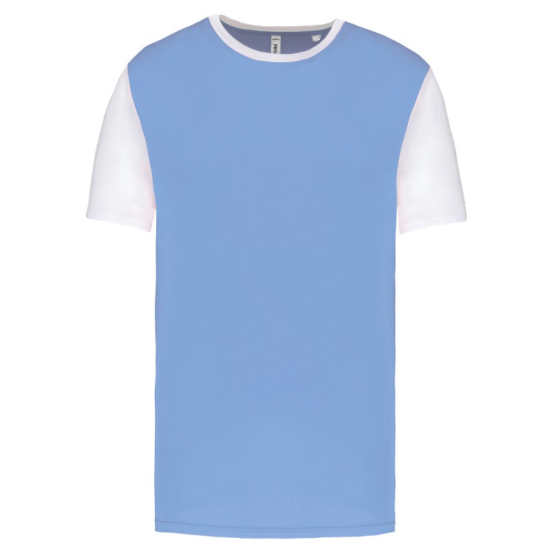 100% polyester. Maille interlock. Coupe droite. Encolure ronde contrastée et bande de propreté. Manches droites contrastées. Finitions double aiguille au bas de manches et de vêtement.