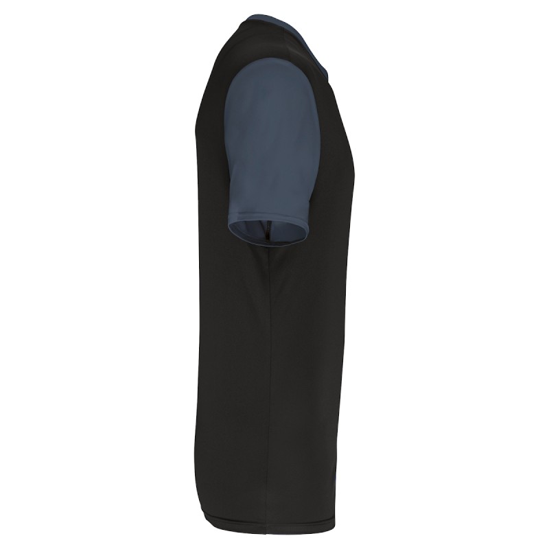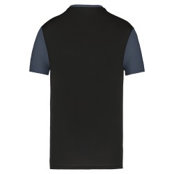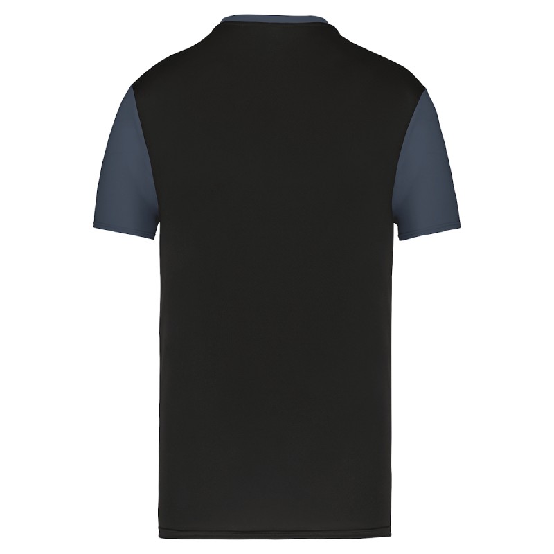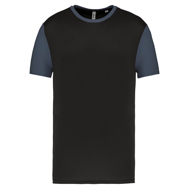 100% polyester. Maille interlock. Coupe droite. Encolure ronde contrastée et bande de propreté. Manches droites contrastées. Finitions double aiguille au bas de manches et de vêtement.