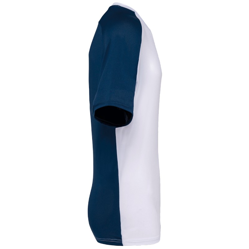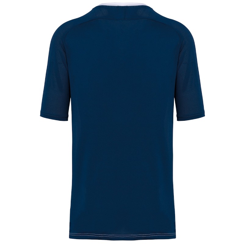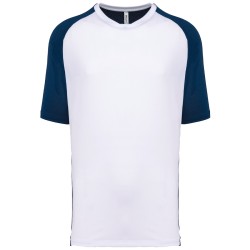 90% polyester/ 10% élasthanne. Partie birdseye : 92% polyester/ 8% élasthanne. Panneaux contrastés en maille "birdseye". Coupe ajustée. Manches raglan. Encolure ronde maille jersey avec montage d'un insert ton sur ton devant col. Bande de propreté jersey ton sur ton. Panneaux contrastés (ou unis pour le coloris Black) en maille birdseye sur les côtés, manches et dos. Finition double aiguille bas de manches et de vêtement. Etiquette de marque Tear-away.
