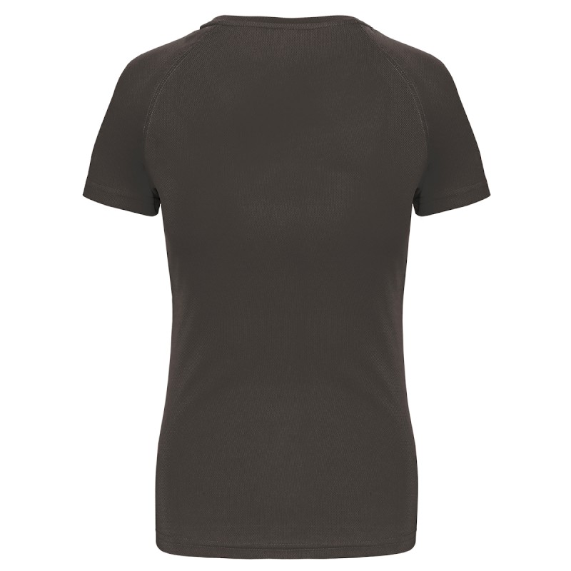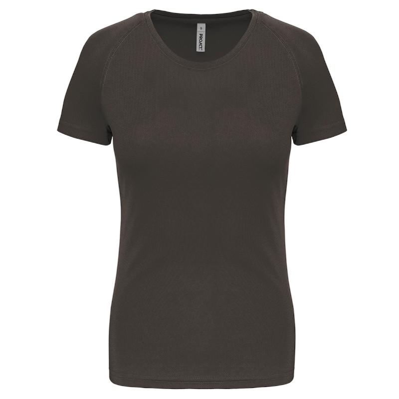 100% polyester. Tissu léger à séchage rapide. Encolure ronde avec bande de propreté. Manches raglan avec points de recouvrement. Finition double aiguille à l'encolure, bas de manches et de vêtement.