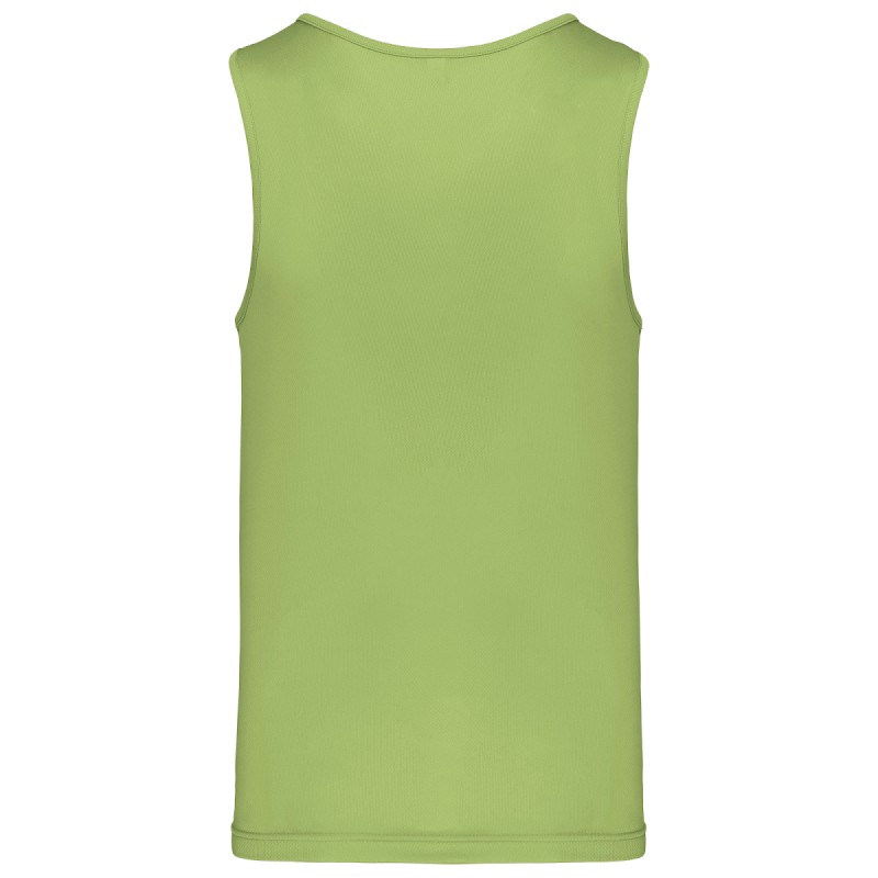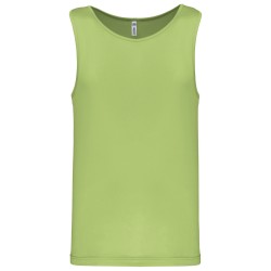 100% polyester. Tissu léger à séchage rapide. Biais à l'encolure et aux emmanchures. Finition double aiguille au bas du vêtement.