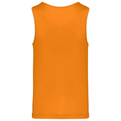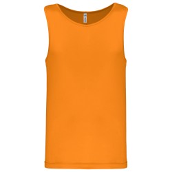 100% polyester. Tissu léger à séchage rapide. Biais à l'encolure et aux emmanchures. Finition double aiguille au bas du vêtement.