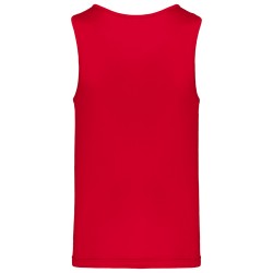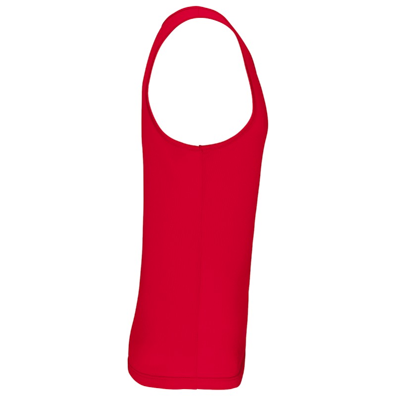 100% polyester. Tissu léger à séchage rapide. Biais à l'encolure et aux emmanchures. Finition double aiguille au bas du vêtement.