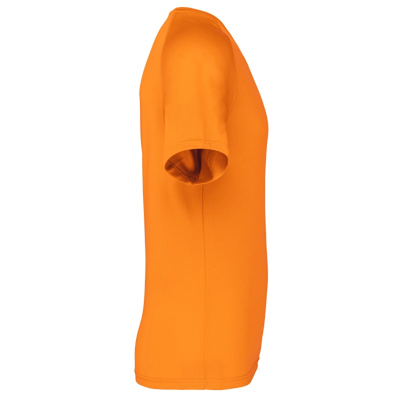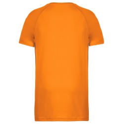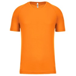 100% polyester. Tissu léger à séchage rapide. Encolure ronde avec bande de propreté. Manches raglan avec points de recouvrement. Finition double aiguille à l'encolure, bas de manche et de vêtement.