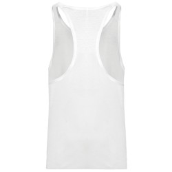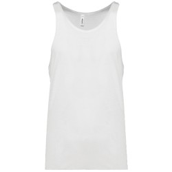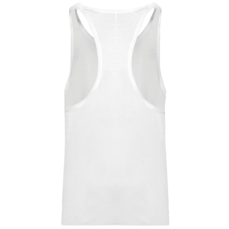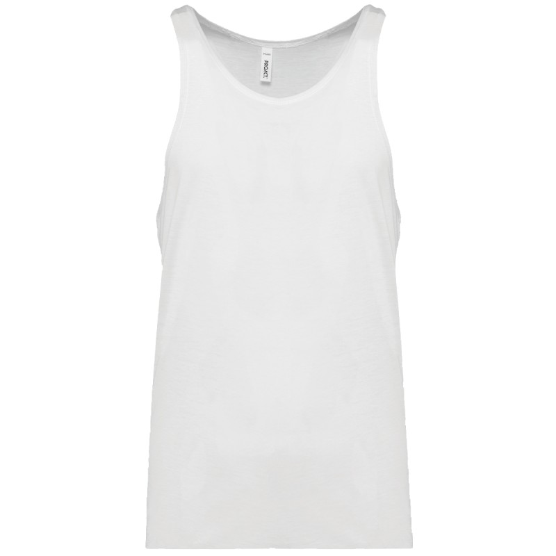 50% polyester/ 25% coton/ 25% viscose. Coupe près du corps. Encolure ronde. Dos échancré. Finition double aiguille à l'emmanchure et bas de vêtement. (Exemple de marquage, vendu vierge).