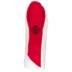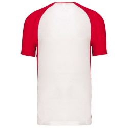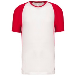 100% polyester. Tissu léger. Manches raglan contrastées et points de recouvrement sur les découpes aux emmanchures. Finition double aiguille au bas du vêtement, des manches et à l'encolure.