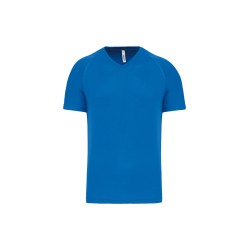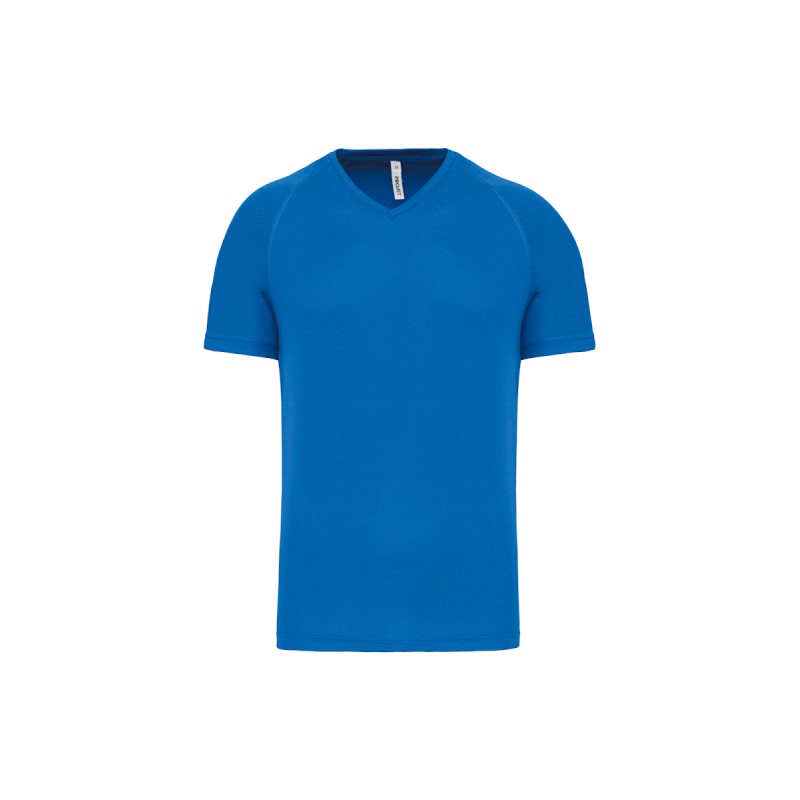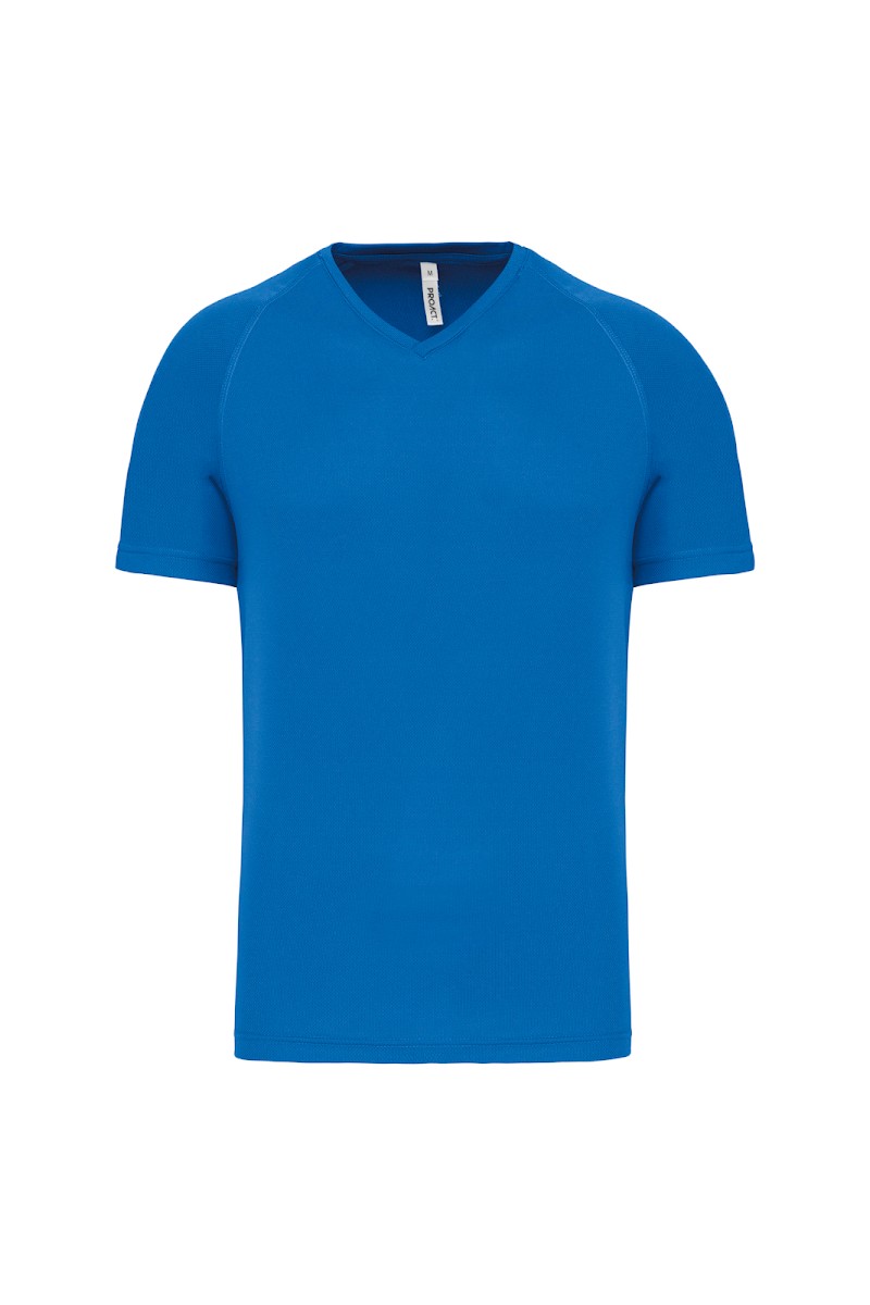 100% polyester. Tissu à séchage rapide. Encolure en V avec bande de propreté. Manches raglan avec points de recouvrement. Finition double aiguille bas de manches et de vêtement.