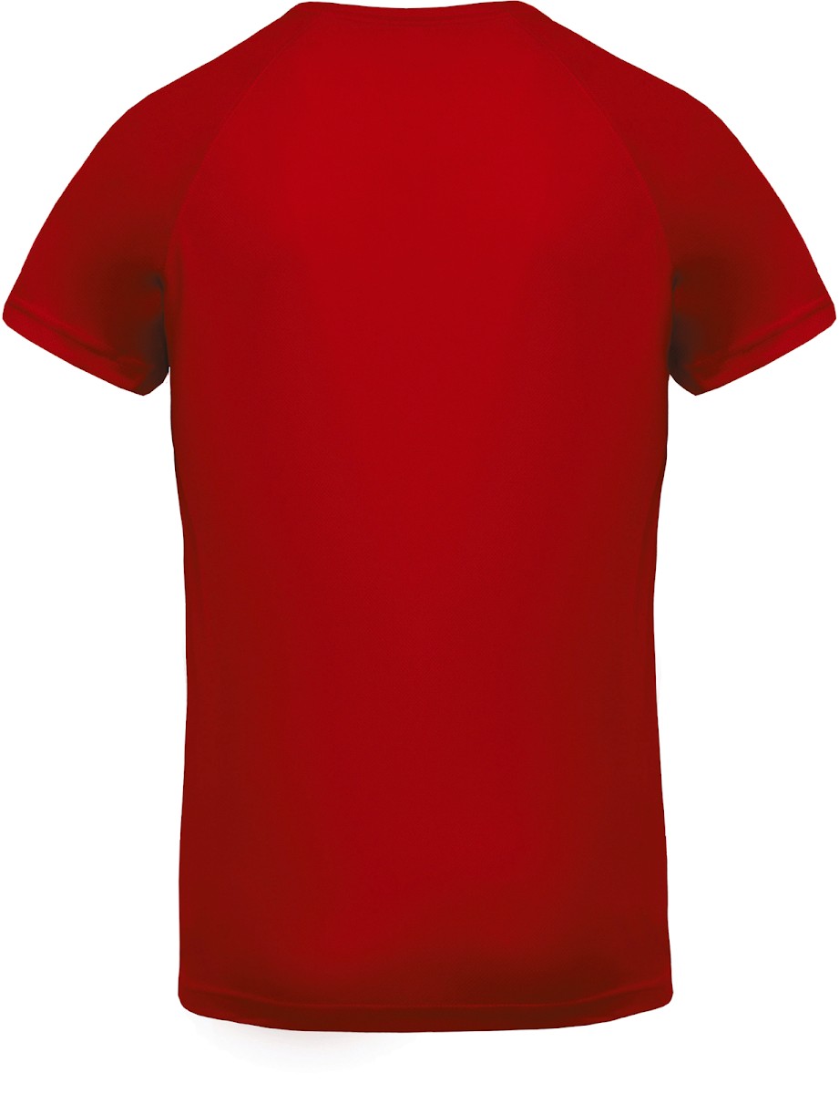 100% polyester. Tissu à séchage rapide. Encolure en V avec bande de propreté. Manches raglan avec points de recouvrement. Finition double aiguille bas de manches et de vêtement.