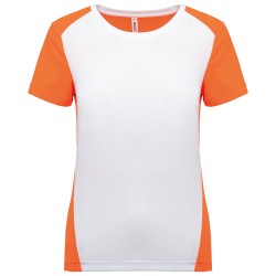 100% polyester birdseye recyclé post consumer. Tissu léger à séchage rapide. Coupe ajustée. Encolure ronde avec bande de propreté. Manches montées. Découpes épaules, manches, dos.  Partie en biais à l'avant contrastée. Finition double aiguille au bas de manches et de vêtement. Etiquette de marque détachable.