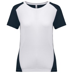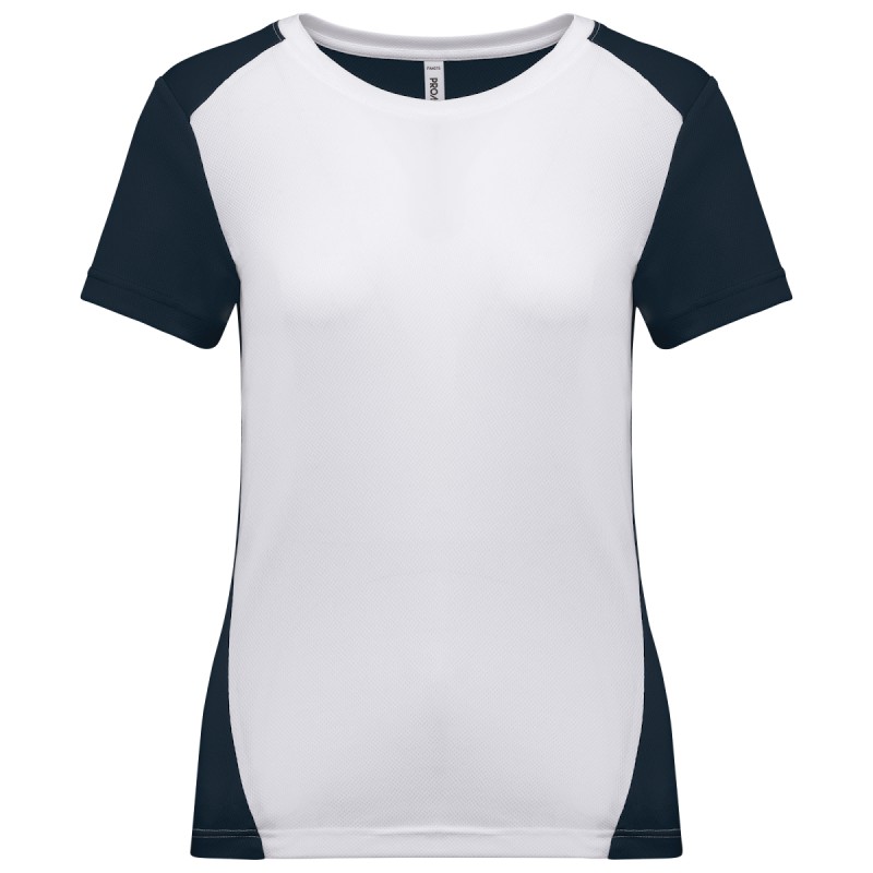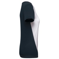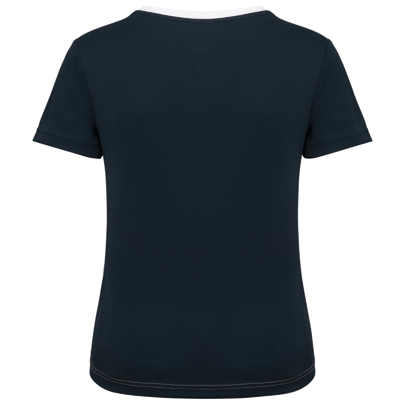 100% polyester birdseye recyclé post consumer. Tissu léger à séchage rapide. Coupe ajustée. Encolure ronde avec bande de propreté. Manches montées. Découpes épaules, manches, dos. Partie en biais à l'avant contrastée. Finition double aiguille au bas de manches et de vêtement. Etiquette de marque détachable.