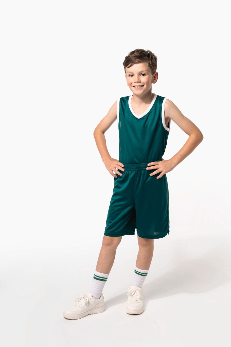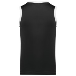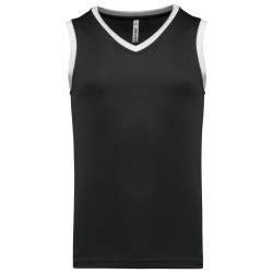 100% polyester birdseye. Encolure en V. Biais contrasté col et emmanchures. Finition double aiguille bas de vêtement. Etiquette de marque détachable.