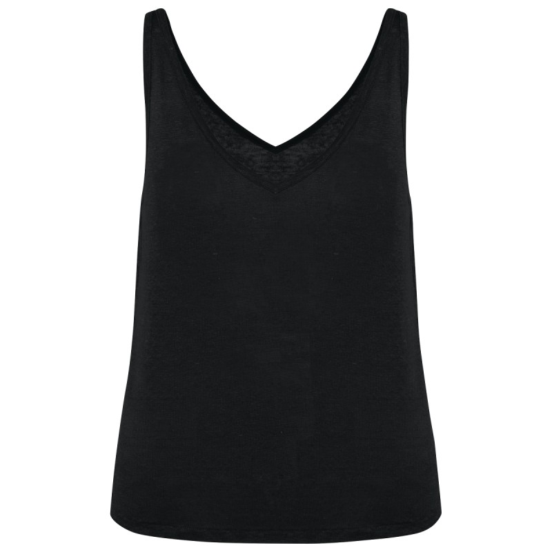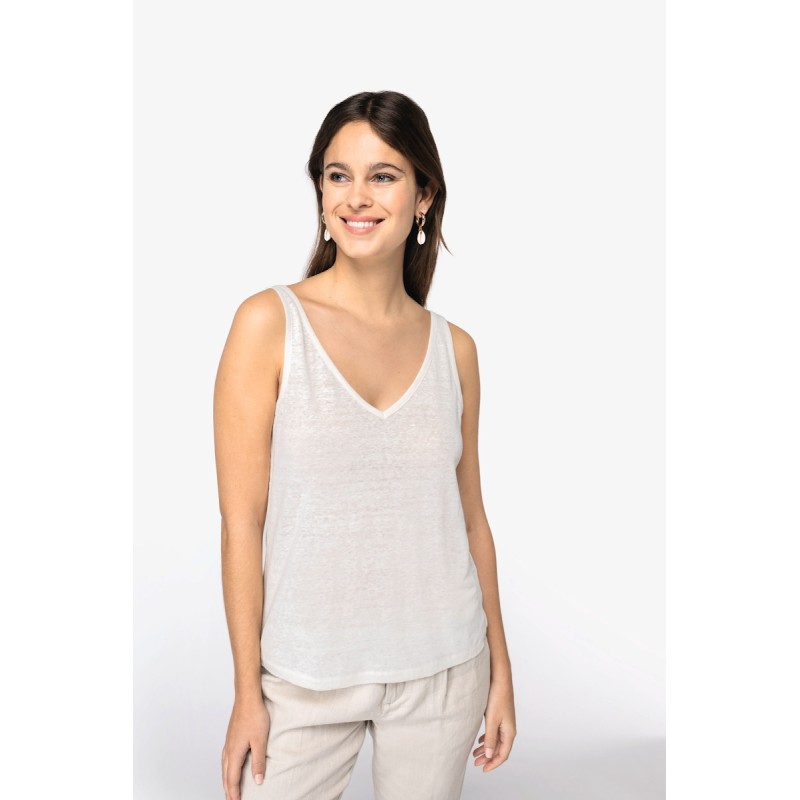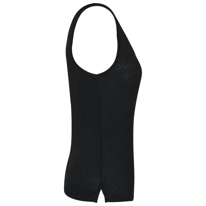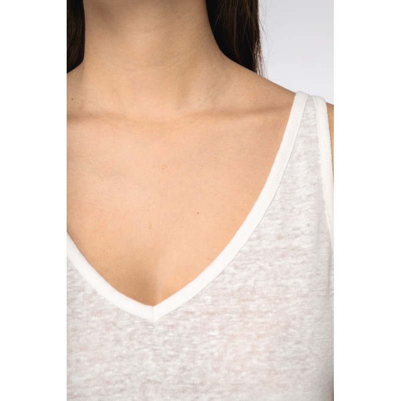100% lin. Maille. Coupe ajustée. Encolure devant et dos en V. Finition encolure et emmanchures avec biais en matière principale et piqûre nervure. Fentes sur les côtés. Ourlet simple surpiqûre bas de vêtement.