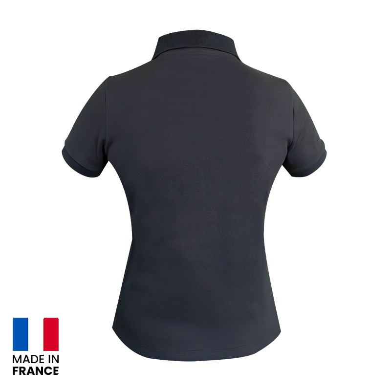 Polo classique Femme Manches courtes Coutures d'épaules renforcées Bande de propreté ton sur ton Col et bas des manches en bord côte Patte de boutonnage 3 boutons blanc brillant Galon tricolore sur la couture latérale Maille piquée Coupe ajustée 97% coton ring-spun / 3% élasthanne 220 gr/m² Lavable à 40°C Fabrication France Teinté et tricoté en France Confectionné en France par des ateliers d'insertion Délai de fabrication : 8 semaines selon la quantité et hors personnalisation