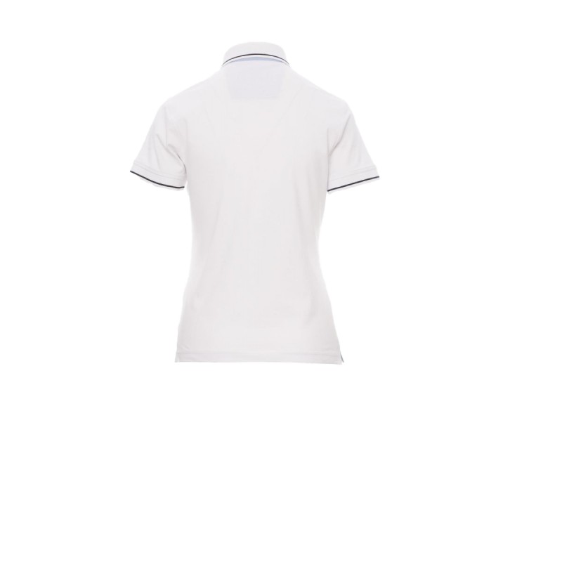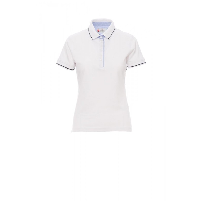 Polo cintré pour femme à manches courtes et 6 boutons blancs, avec intérieur col, patte et fentes latérales en Oxford bleu ciel, col et bordure des manches en bord côtes avec fin profil en contraste, œillets sous les bras, fentes latérales avec couture de renfort, ruban de renfort latéral, coutures stretch, renfort profilé sur encolure arrière