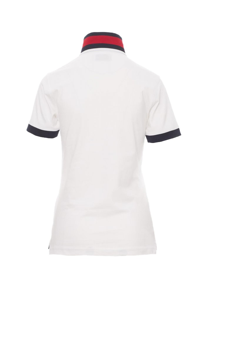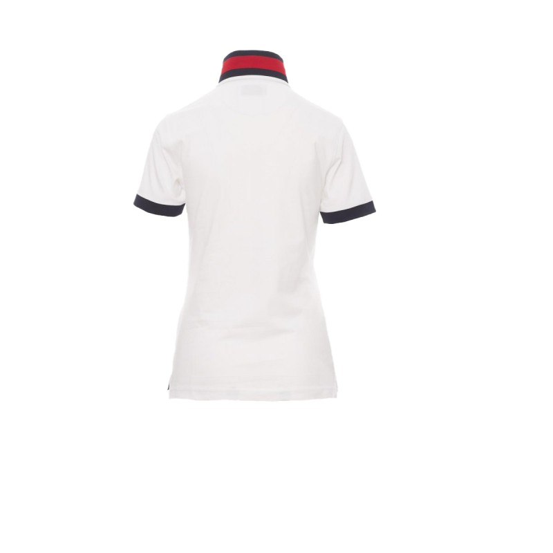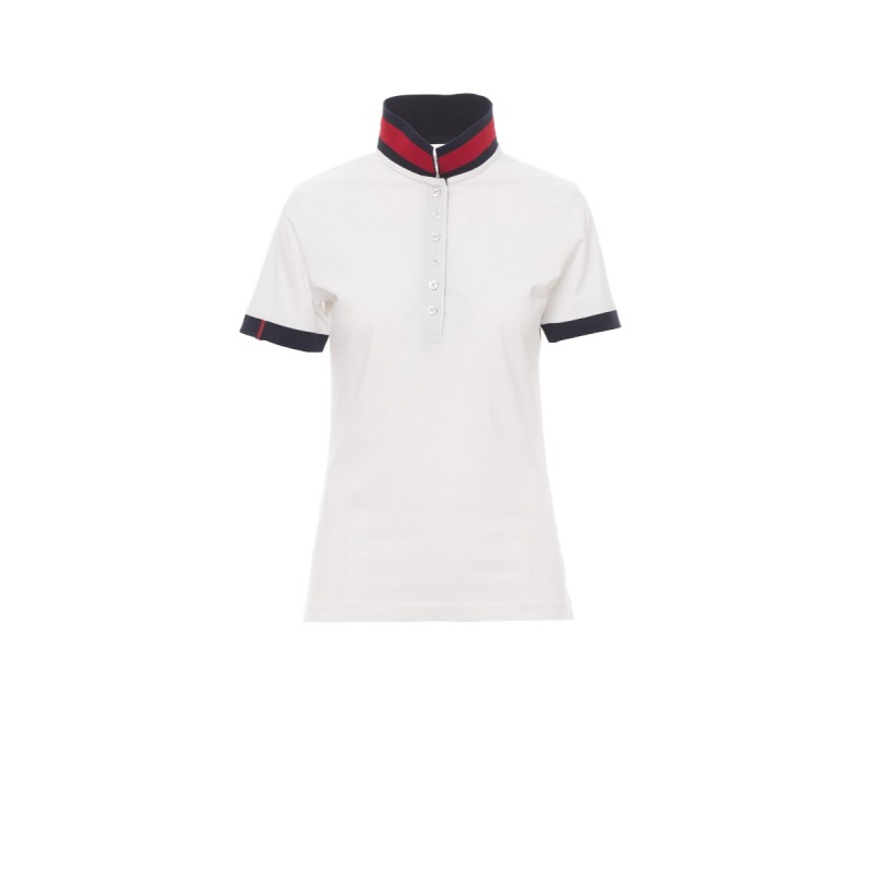 Polo femme, coupe cintrée, à manches courtes, 6 boutons teinte assortie effet nacré, col teinte assortie d'un côté et avec rayures contrastées de l'autre, visibles uniquement avec col remonté. Col boutonné à l'intérieur, fentes latérales en contraste, bas de manche droite avec insert fin assorti aux couleurs du col, finition des manches en bord-côte, coutures du col couvertes par ruban en contraste, ruban de renfort latéral, ruban de renfort à l'intérieur du col.