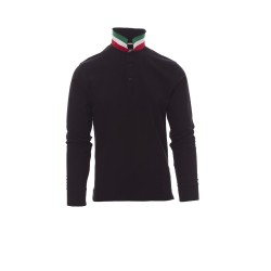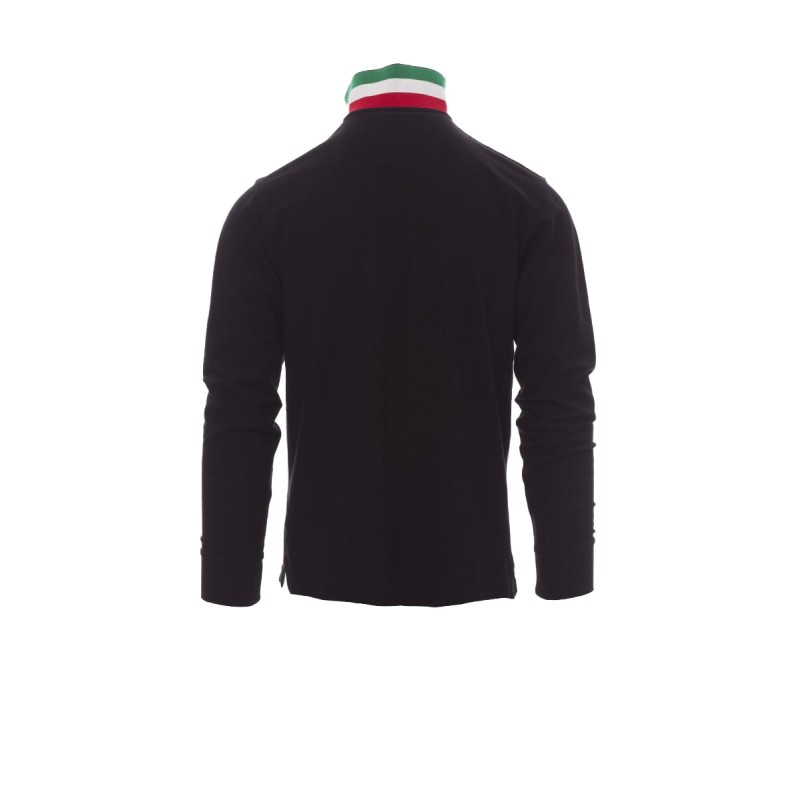 Polo homme à manches longues, 3 boutons teinte assortie effet nacré, col teinte assortie d'un côté et avec rayures tricolores contrastées de l'autres, visibles uniquement avec col remonté . Col boutonné à l'intérieur, fentes latérales avec insert tricolore, col et poignets en bord-côte, coutures du col couvertes ruban de renfort latéral, ruban de renfort à l'intérieur du col.