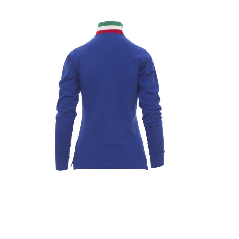 Polo femme, coupe cintrée, à manches longues, 5 boutons teinte assortie effet nacré, col teinte assortie d'un côté et avec rayures tricolore contrastées de l'autre côté, visibles uniquement avec col remonté . Col boutonné à l'intérieur, fentes latérales avec insert tricolore, col et poignets en bord-côte, coutures du col couvertes ruban de renfort latéral.