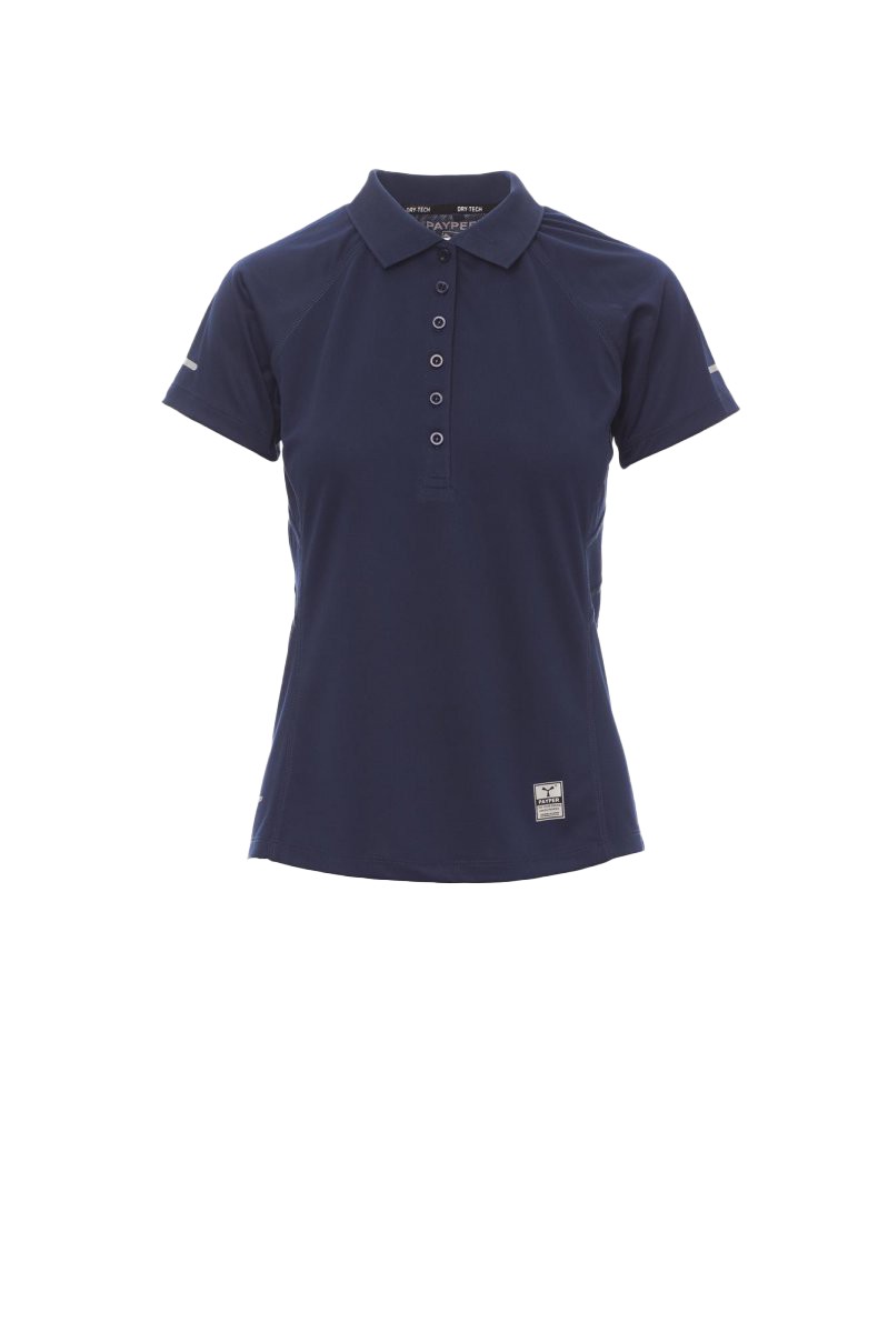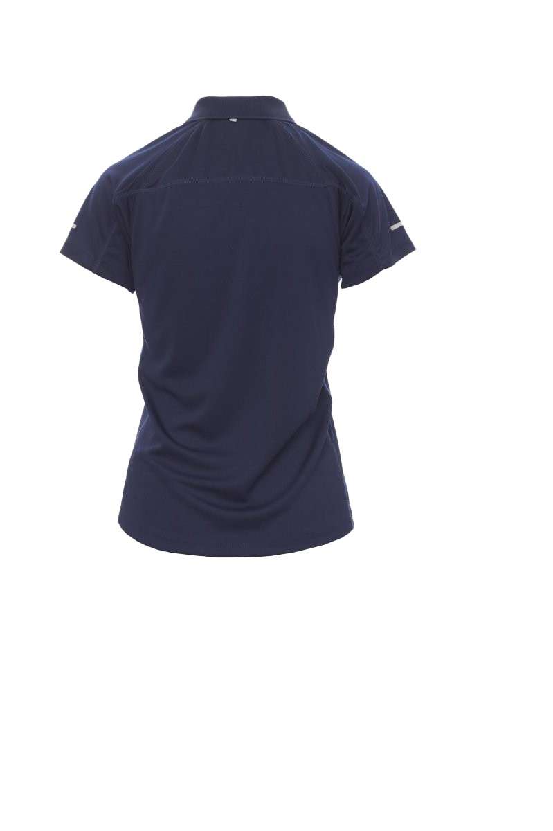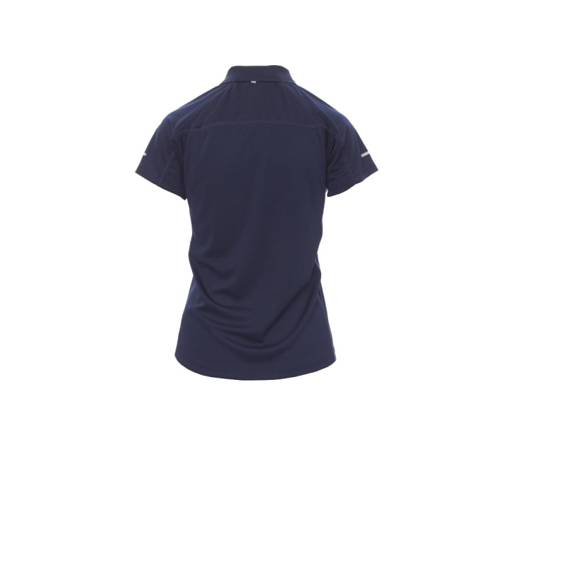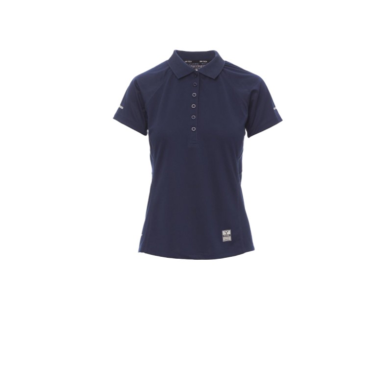 Polo femme technique-sportif cintré, à manches courtes, à six boutons assortis, manches raglan, double couture latérale gage de meilleure portabilité, bas profilé et plus long à l'arrière, insert réfléchissant sur manches et encolure arrière, ruban du col en contraste, étiquette transfert.