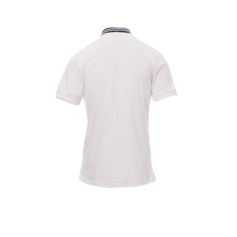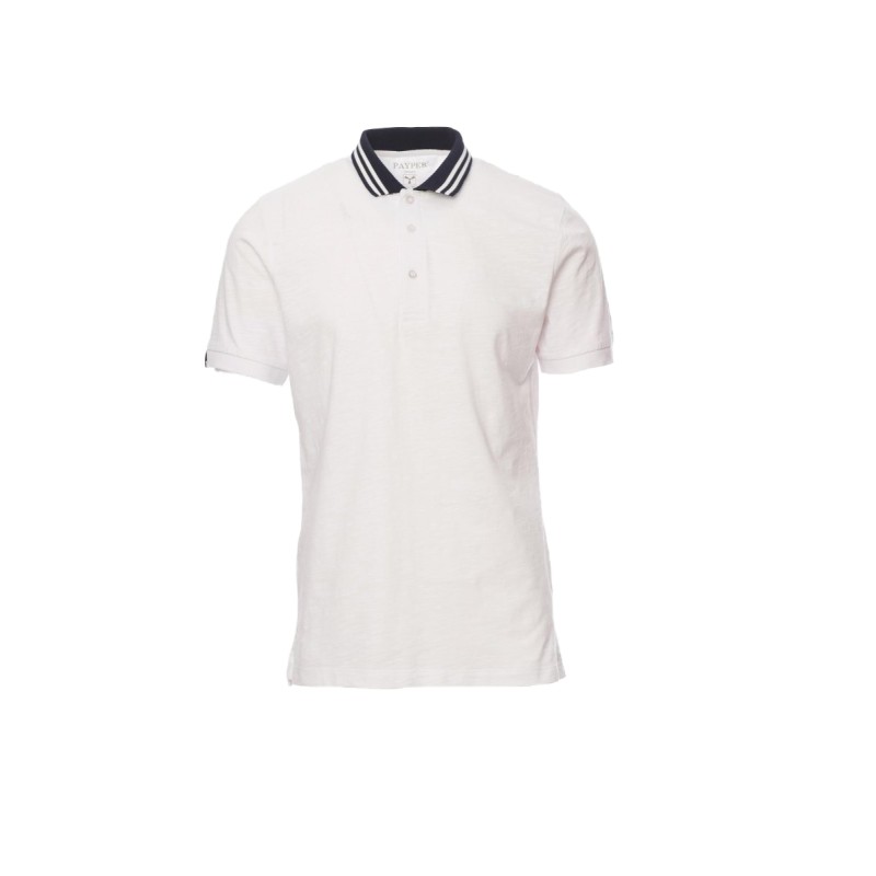 Polo homme à manches courtes, 3 boutons teinte assortie effet nacré, rayures contrastées d'un côté du col et rayures fluorescentes de l'autre, visibles uniquement avec col remonté. Col et bord des manches en bord-côte, manche droite avec fin insert, fentes latérales et coutures du col couvertes avec ruban fluo, étiquette transfert.