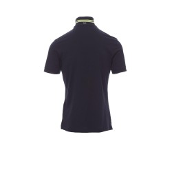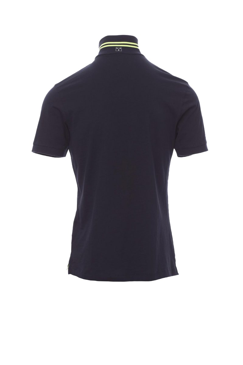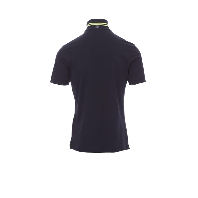 Polo homme à manches courtes, 3 boutons teinte assortie effet nacré, rayures contrastées d'un côté du col et rayures fluorescentes de l'autre, visibles uniquement avec col remonté. Col et bord des manches en bord-côte, manche droite avec fin insert, fentes latérales et coutures du col couvertes avec ruban fluo, étiquette transfert.