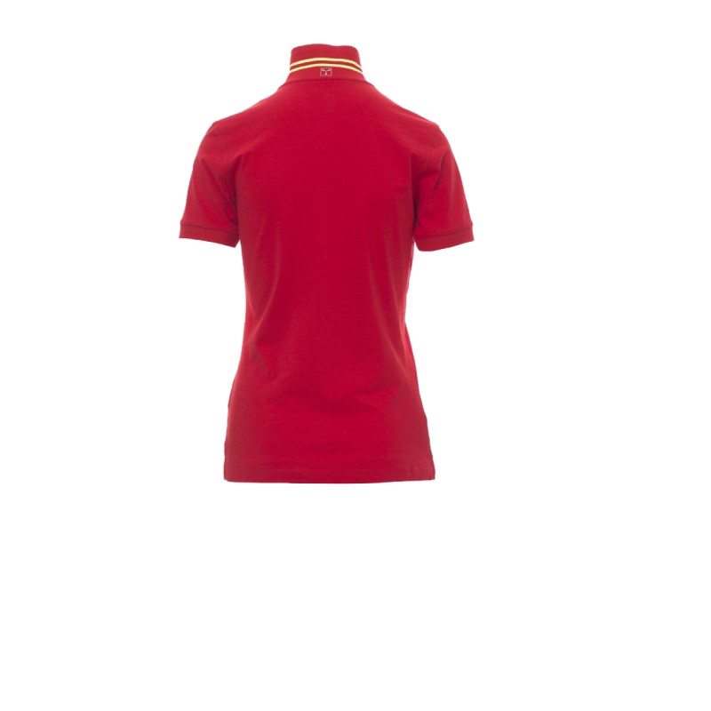 Polo femme, coupe cintrée, à manches courtes et 6 boutons teinte assortie effet nacré, rayures contrastées d'un côté du col et rayures fluorescentes de l'autre, visibles uniquement avec col remonté. Col et bord des manches en bord-côte, manche droite avec fin insert, fentes latérales et coutures du col couvertes avec ruban fluo, étiquette transfert.
