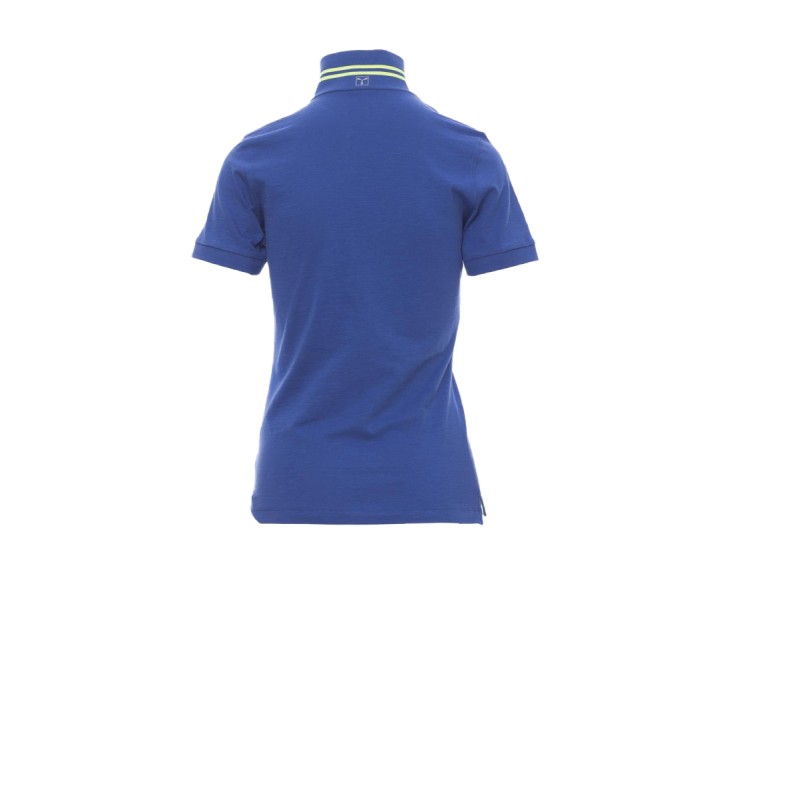 Polo femme, coupe cintrée, à manches courtes et 6 boutons teinte assortie effet nacré, rayures contrastées d'un côté du col et rayures fluorescentes de l'autre, visibles uniquement avec col remonté. Col et bord des manches en bord-côte, manche droite avec fin insert, fentes latérales et coutures du col couvertes avec ruban fluo, étiquette transfert.