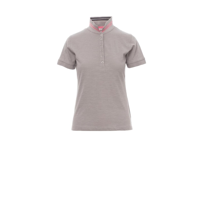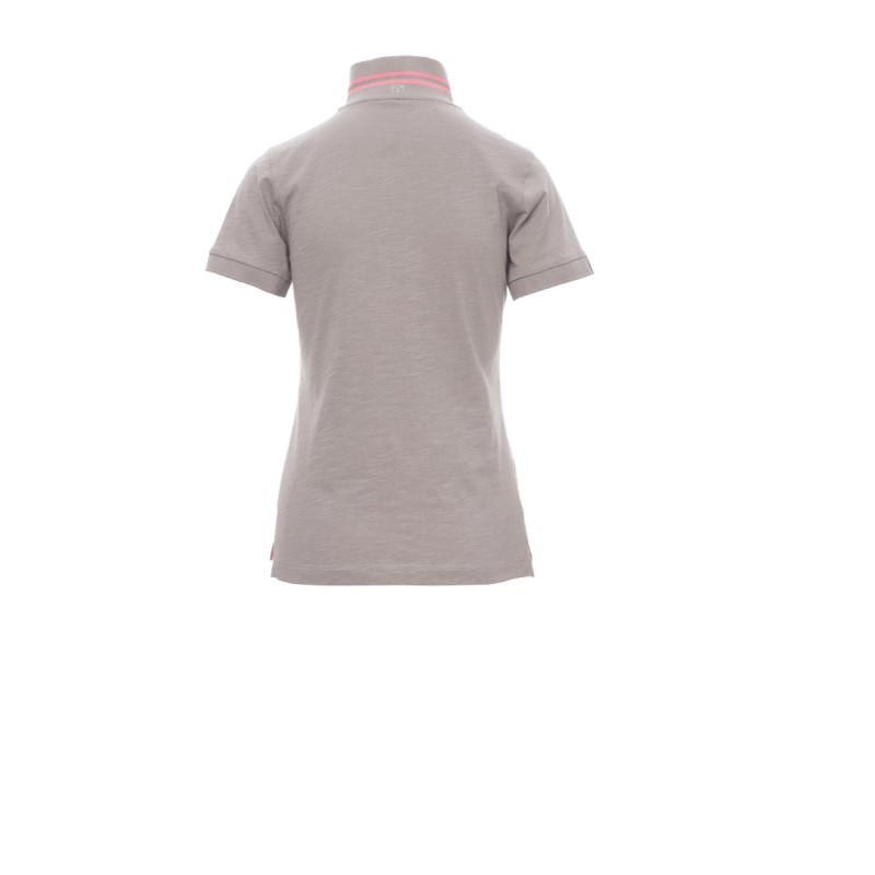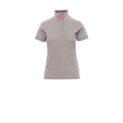 Polo femme, coupe cintrée, à manches courtes et 6 boutons teinte assortie effet nacré, rayures contrastées d'un côté du col et rayures fluorescentes de l'autre, visibles uniquement avec col remonté. Col et bord des manches en bord-côte, manche droite avec fin insert, fentes latérales et coutures du col couvertes avec ruban fluo, étiquette transfert.