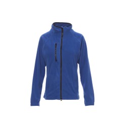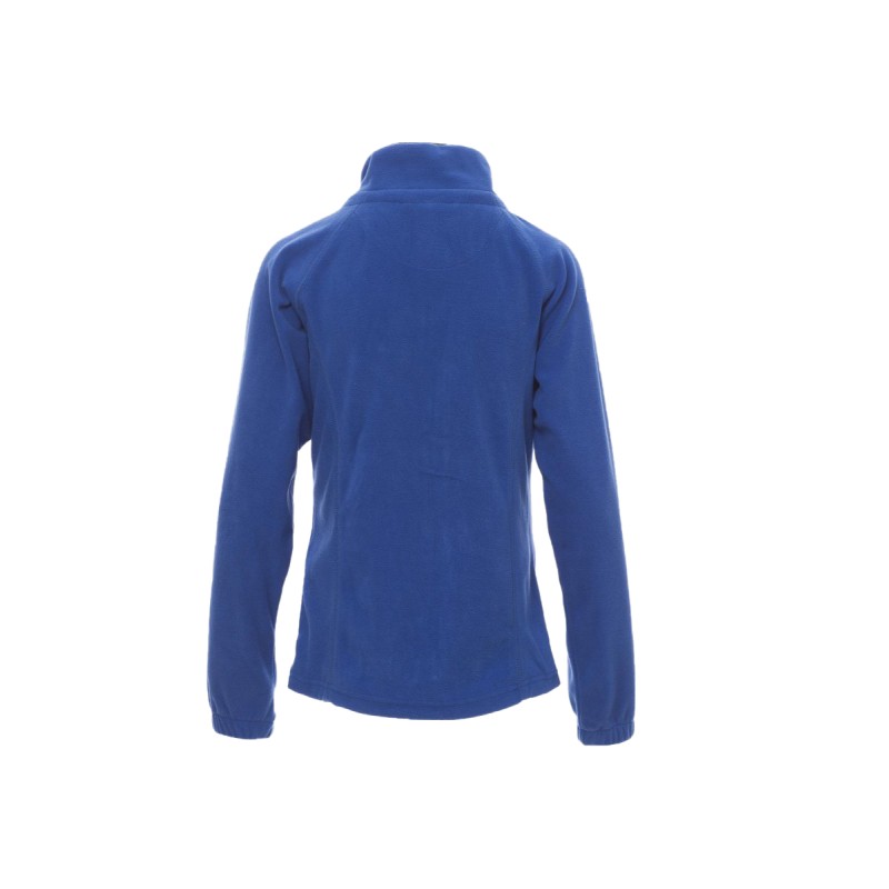 Veste polaire cintrée pour femme à zip intégral de 8 mm en plastique noir, manches raglan, coulisse réglable à la taille, élastiques serre-poignet, deux poches avec zips couverts, une poche avec zip sur le devant, col avec bordure de renfort en contraste, coutures renforcées.