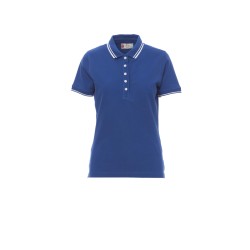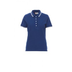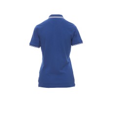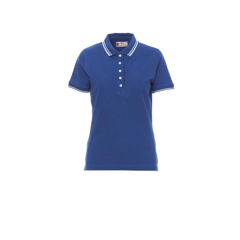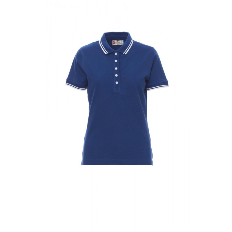 Polo cintré pour femme à manches courtes et 5 boutons blancs, col et bordure des manches en bord côtes avec fin profil en contraste, fentes latérales avec couture de renfort, coutures du col couvertes, ruban de renfort latéral, coutures stretch, renfort profilé sur encolure arrière.