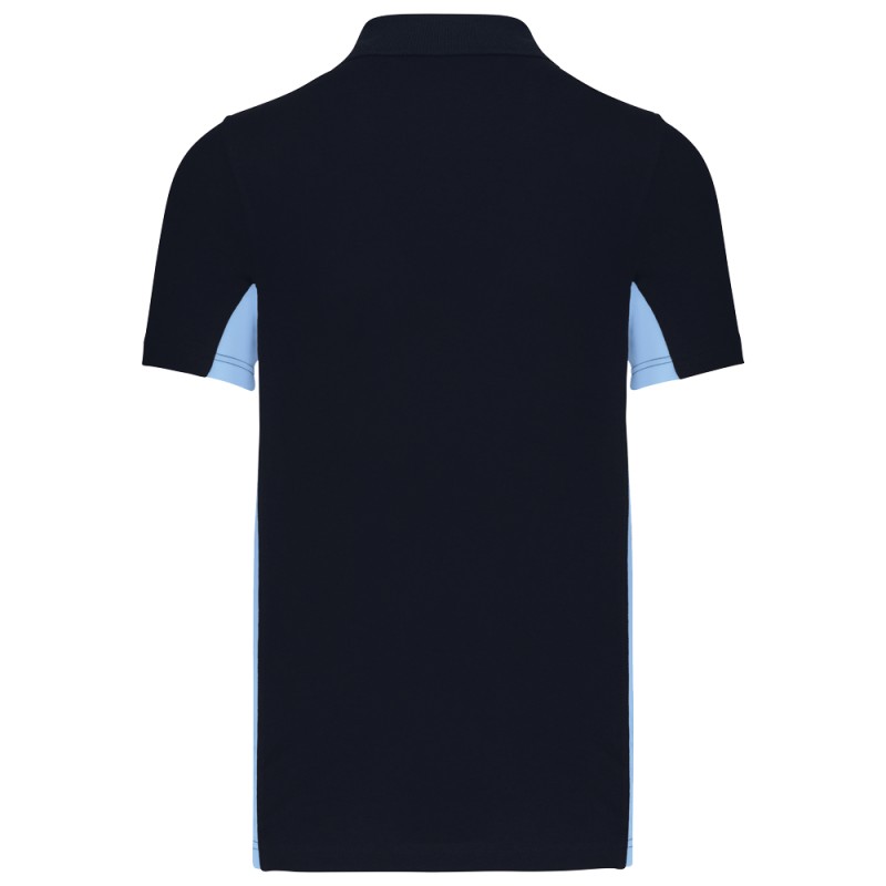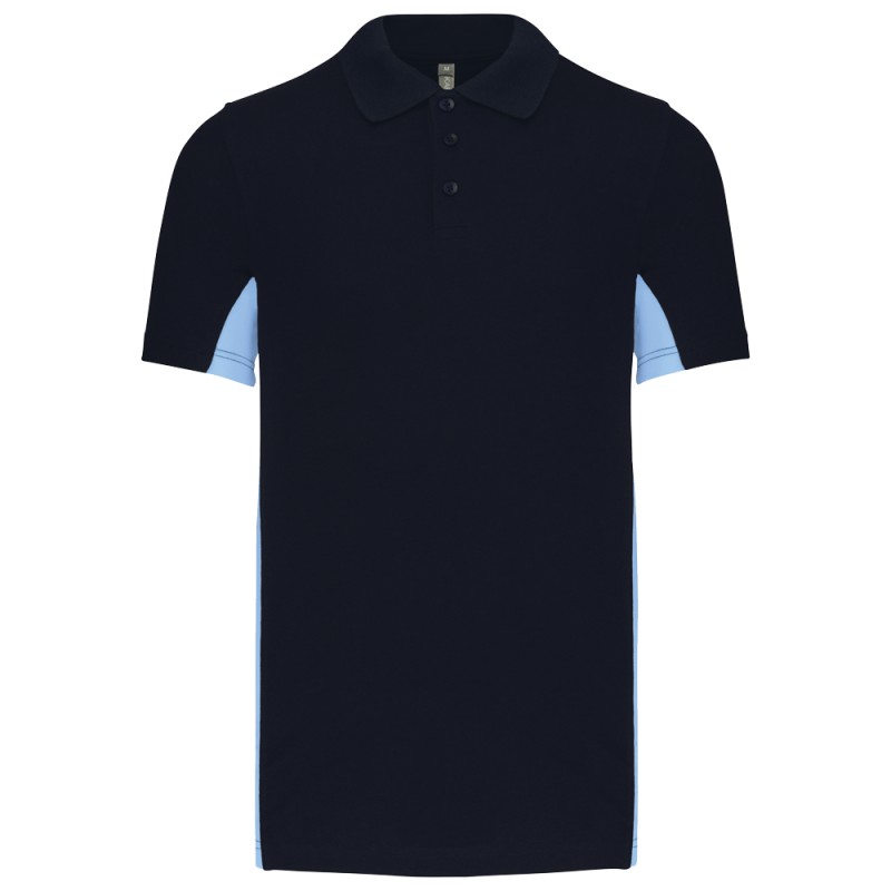 65% polyester / 35% coton. (Black/Dark Grey ; Forest Green/Black ; Royal Blue/Navy : 65% polyester recyclé / 35% coton). Maille piquée. Col en bord-côte. Patte de boutonnage 3 boutons ton sur ton. Découpes contrastées sur côtés et dessous de manches. Bas de manche non resserré.