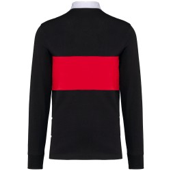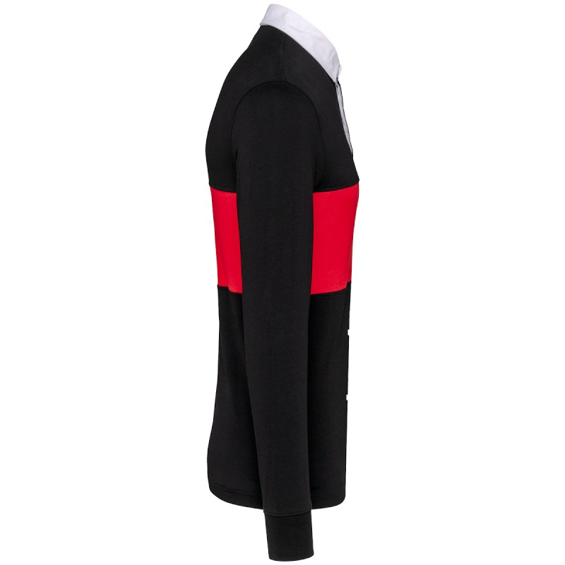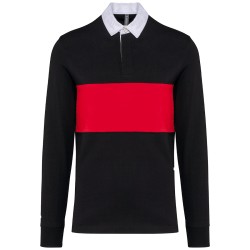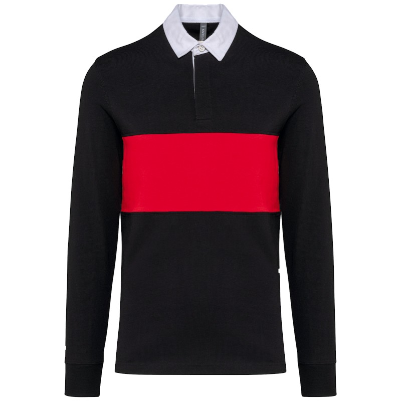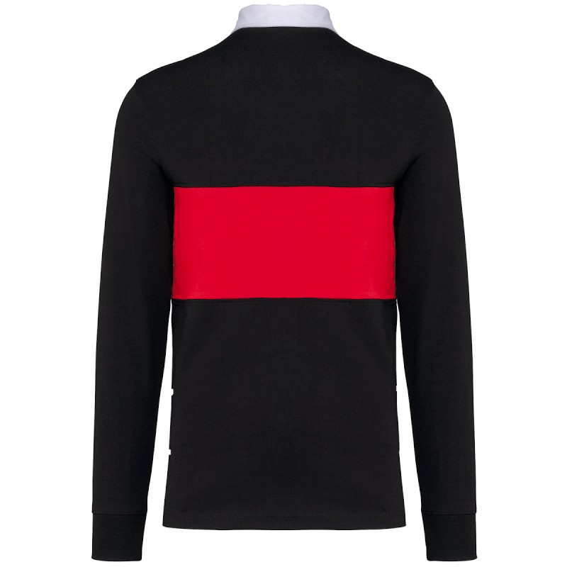 100% coton. Tissu jersey. Coupe droite. Col et patte intérieure en coton sergé blanc. Patte 3 boutons en caoutchouc. Poignets en bord-côtes 1 x 1. Bande de propreté col en chevron ton sur ton. Bande centrale devant et dos en couleur contrastée. Bas de vêtement avec fentes latérales et bande chevron ton sur ton. Surpiqûre double aiguille aux emmanchures et aux poignets. Finitions double aiguille bas de vêtement. Etiquette de marque détachable.