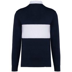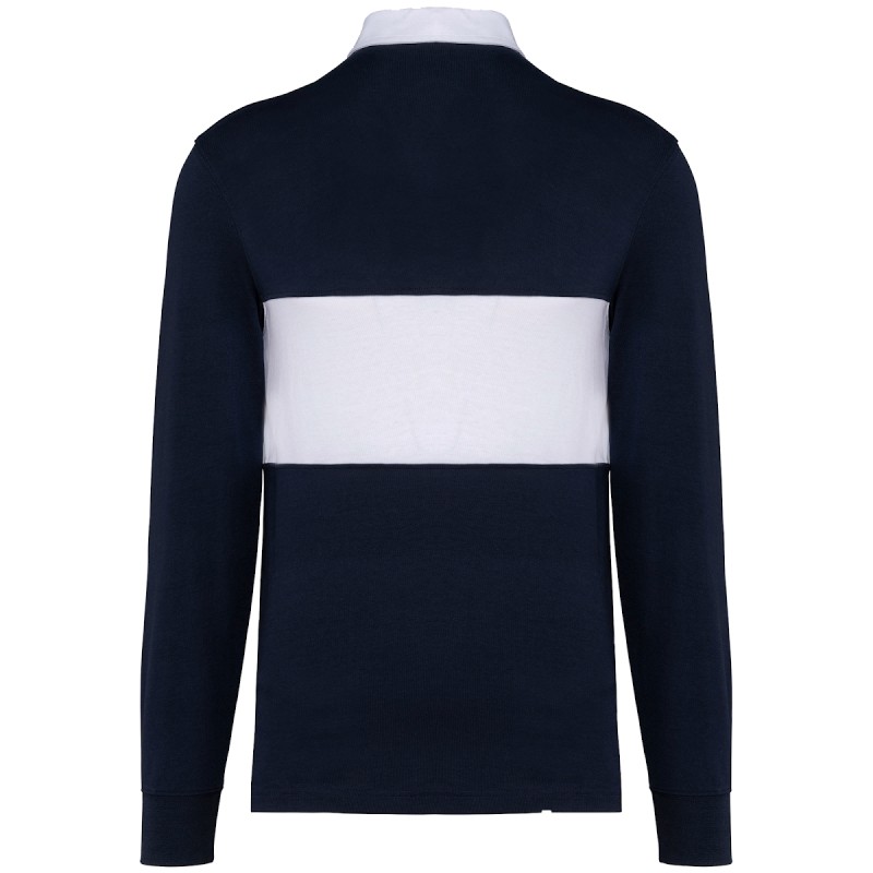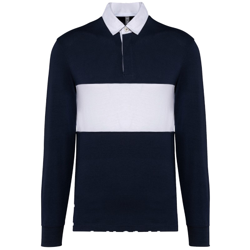 100% coton. Tissu jersey. Coupe droite. Col et patte intérieure en coton sergé blanc. Patte 3 boutons en caoutchouc. Poignets en bord-côtes 1 x 1. Bande de propreté col en chevron ton sur ton. Bande centrale devant et dos en couleur contrastée. Bas de vêtement avec fentes latérales et bande chevron ton sur ton. Surpiqûre double aiguille aux emmanchures et aux poignets. Finitions double aiguille bas de vêtement. Etiquette de marque détachable.
