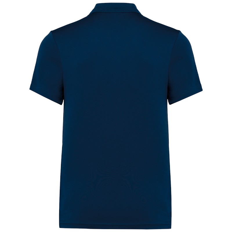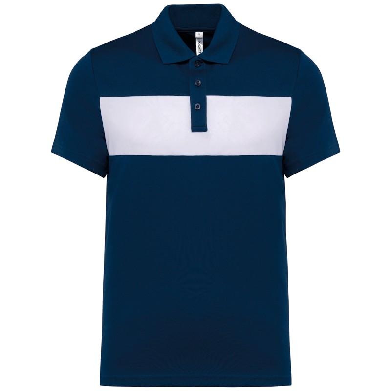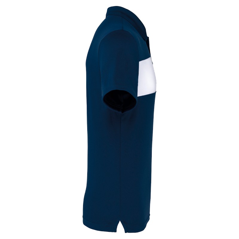 100% polyester. Maille interlock. Empiècement poitrine contrasté. Col en bord-côte avec bande de propreté. Patte 3 boutons ton sur ton. Fentes latérales. Finition double aiguille bas de manches et de vêtement.
