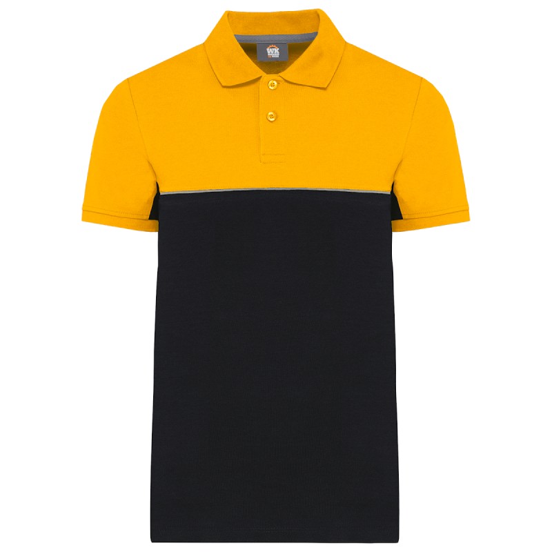 60% coton / 40% polyester recyclé. Coton peigné. Fil Vortex. Maille piquée. Traitement antiboulochage. Lavable à 60°C. Coupe ajustée. Patte 2 boutons ton sur ton. Col en bord-côte 1x1 avec bande de propreté contrastée en chevron. Passepoil contrasté entre les parties bicolores du vêtement (corps, devant et dos). Finitions bord-côte au bas de manches. Fentes latérales avec bande chevron contrastée. Finition double aiguille au bas de vêtement. Etiquette de marque Tear Away.