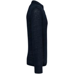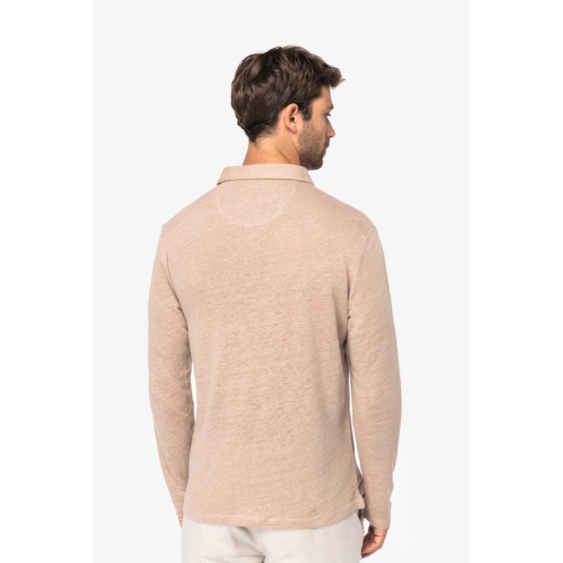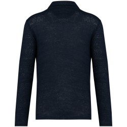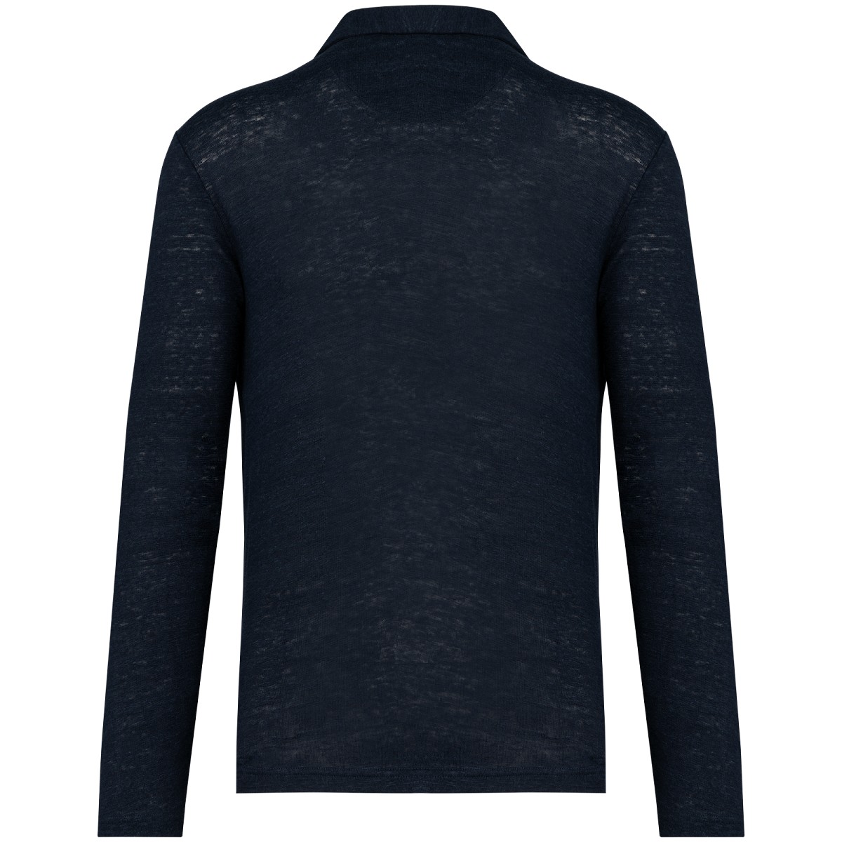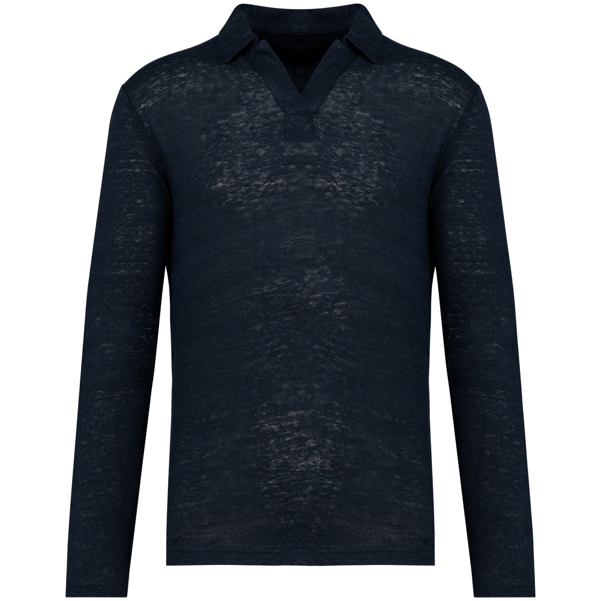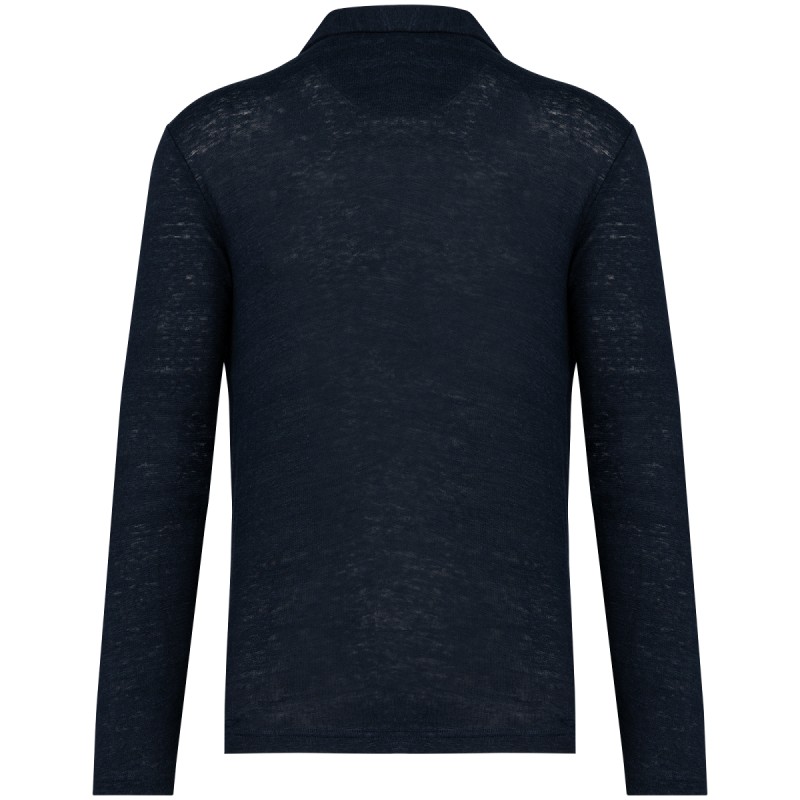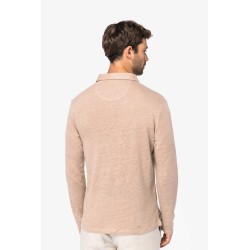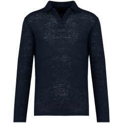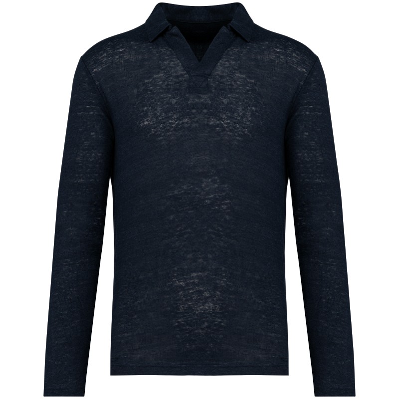 100% lin. Maille. Coupe ajustée. Demi lune au dos. Col et patte polo en V sans bouton en matière principale. Ourlet double surpiqûre bas de manches et de vêtement. Fentes côtés avec finition bande de propreté intérieure en matière principale.