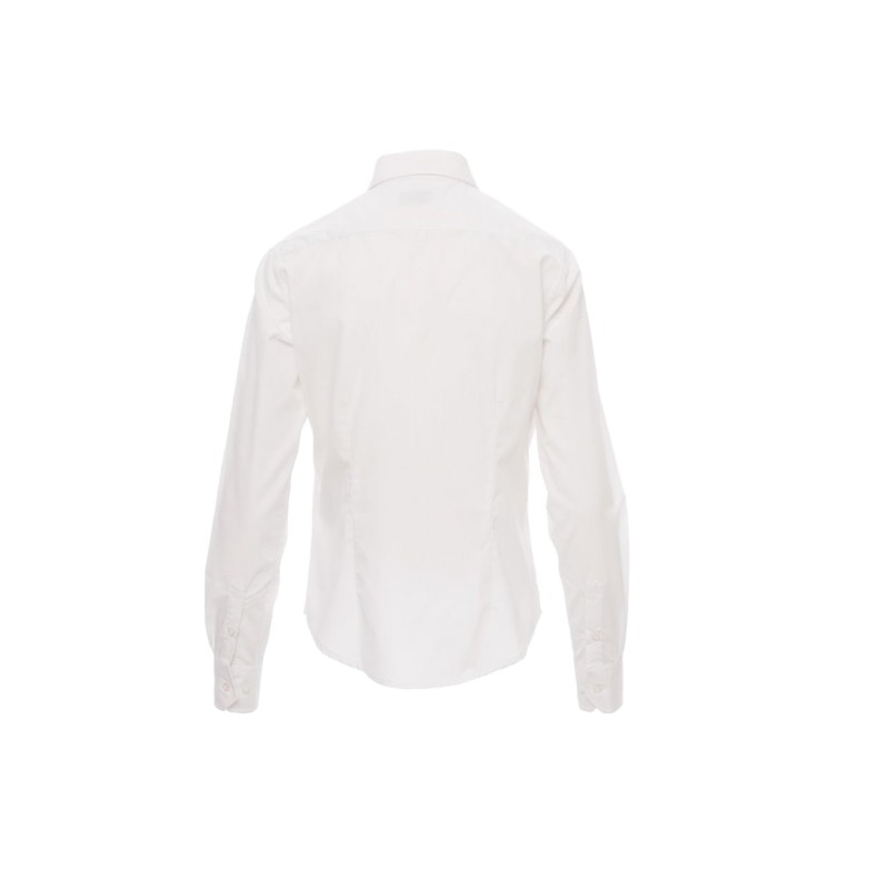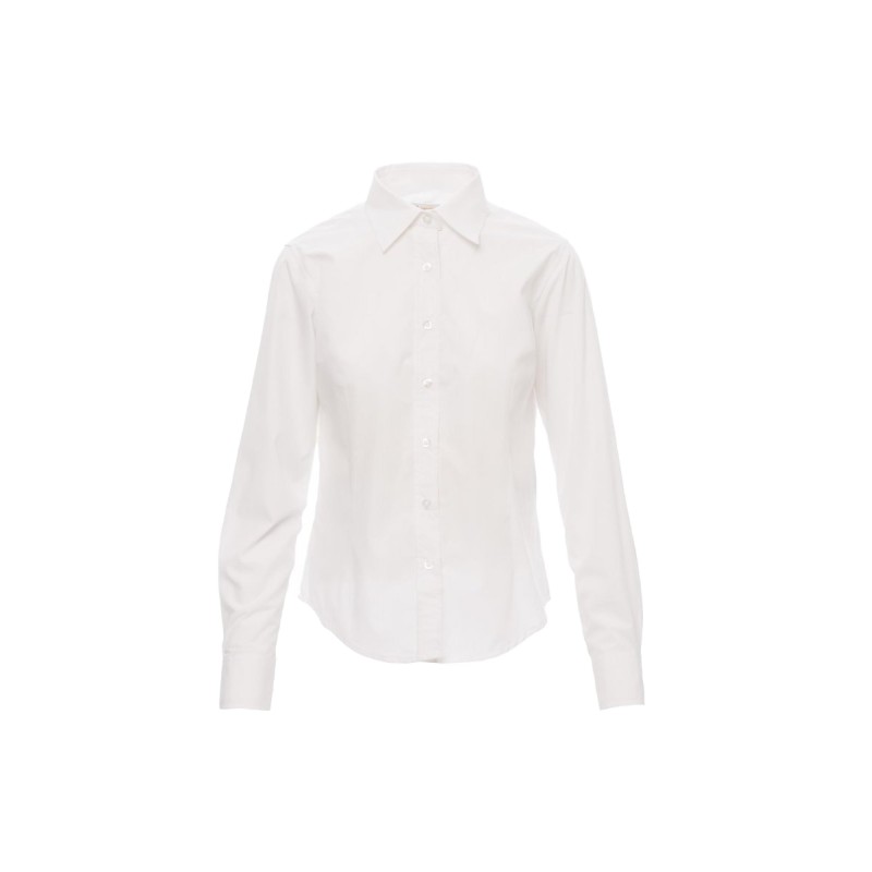Chemise femme, fil de coton peigné très fin, coupe cintrée, pinces de reprise devant et derrière, col italien, poignets profilés avec deux boutons et une boutonnière, patte de boutonnage visible et boutons teinte assortie. Empiècement droit dans le dos. Tissu traité Easy Care.