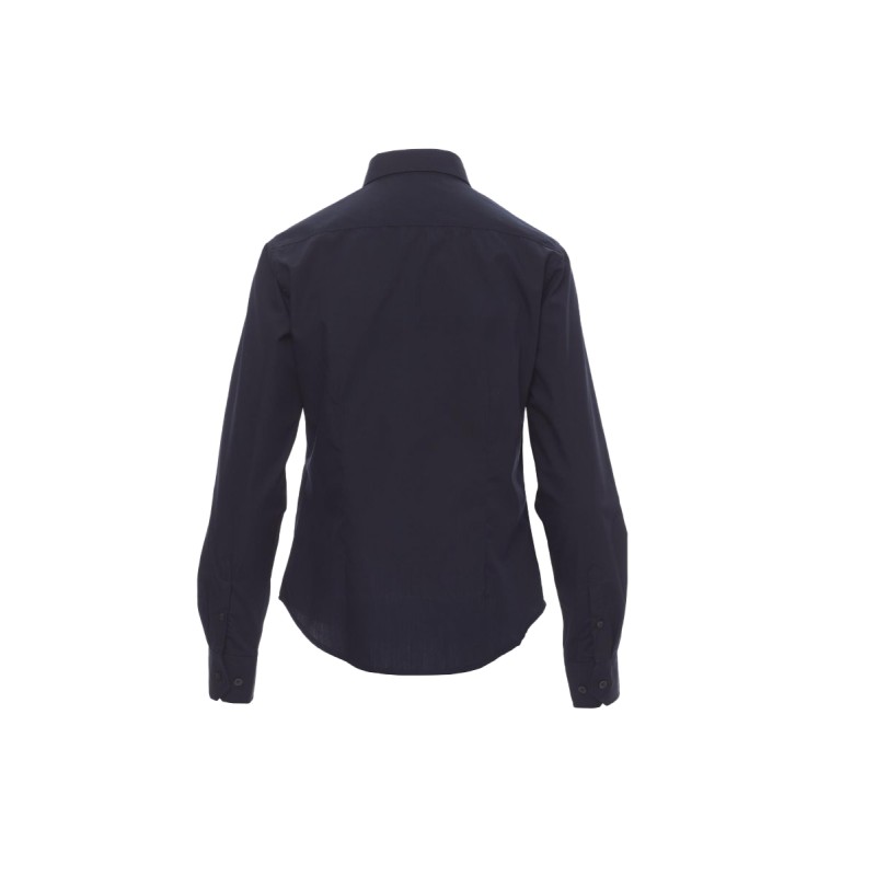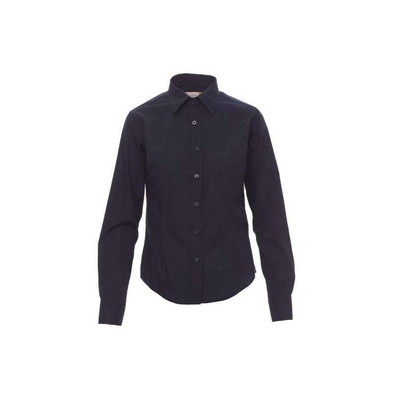 Chemise femme, fil de coton peigné très fin, coupe cintrée, pinces de reprise devant et derrière, col italien, poignets profilés avec deux boutons et une boutonnière, patte de boutonnage visible et boutons teinte assortie. Empiècement droit dans le dos. Tissu traité Easy Care.