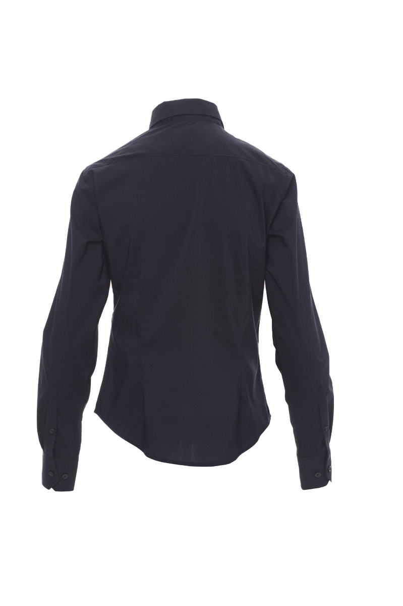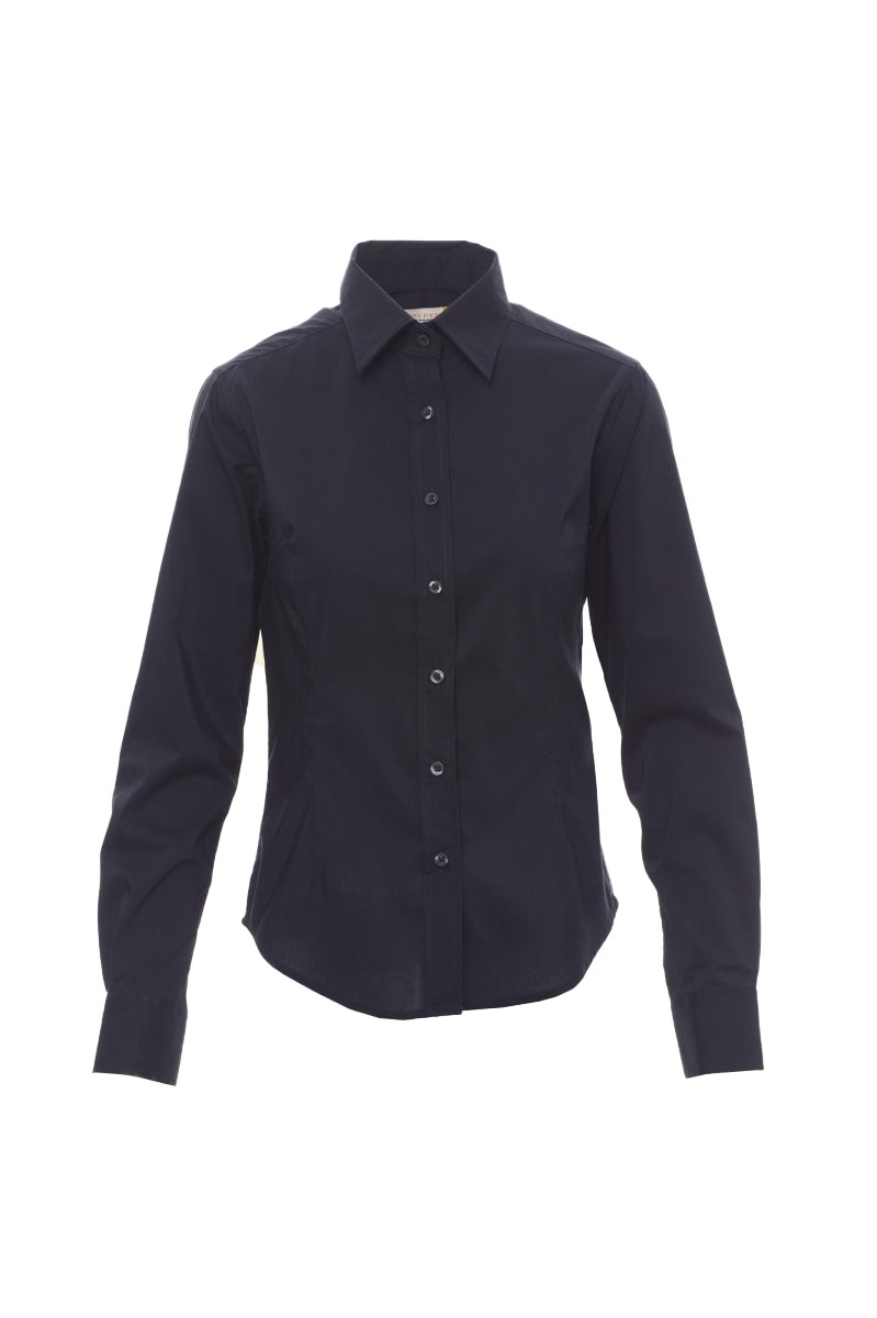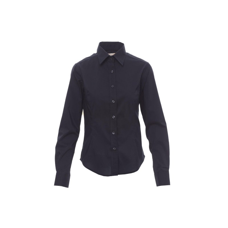 Chemise femme, fil de coton peigné très fin, coupe cintrée, pinces de reprise devant et derrière, col italien, poignets profilés avec deux boutons et une boutonnière, patte de boutonnage visible et boutons teinte assortie. Empiècement droit dans le dos. Tissu traité Easy Care.