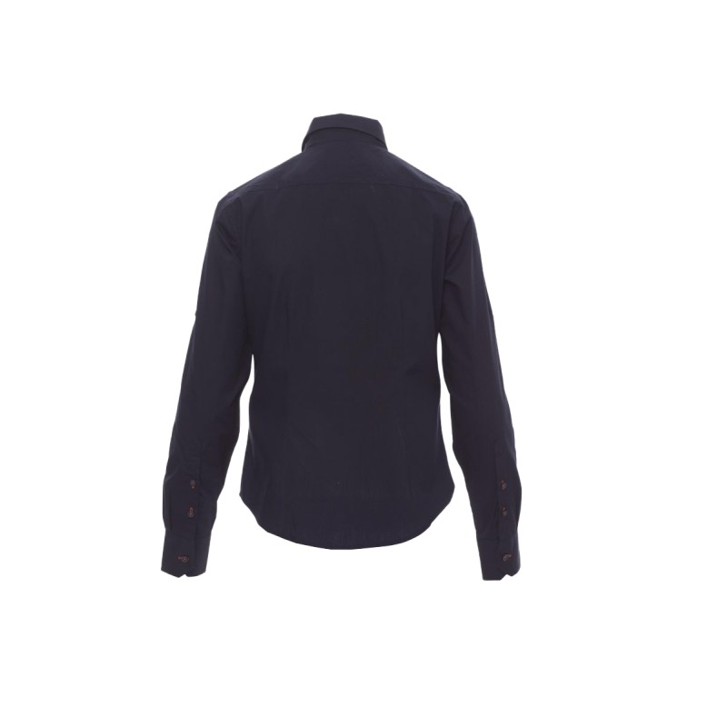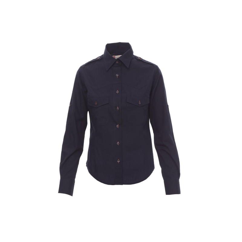 Chemise femme, fil de coton peigné très fin, coupe légèrement cintrée, empiècement droit devant, fermeture par boutons assortis avec boutonnières contrastées, épaulettes, deux poches sur la poitrine avec rabat et porte-stylo . Patte avec bouton sur le bras pour retrousser facilement les manches. La chemise blanche n'a pas de boutonnières contrastées ni d'empiècement devant. Tissu traité Easy Care.