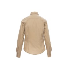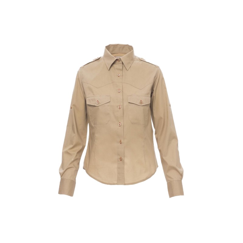 Chemise femme, fil de coton peigné très fin, coupe légèrement cintrée, empiècement droit devant, fermeture par boutons assortis avec boutonnières contrastées, épaulettes, deux poches sur la poitrine avec rabat et porte-stylo . Patte avec bouton sur le bras pour retrousser facilement les manches. La chemise blanche n'a pas de boutonnières contrastées ni d'empiècement devant. Tissu traité Easy Care.