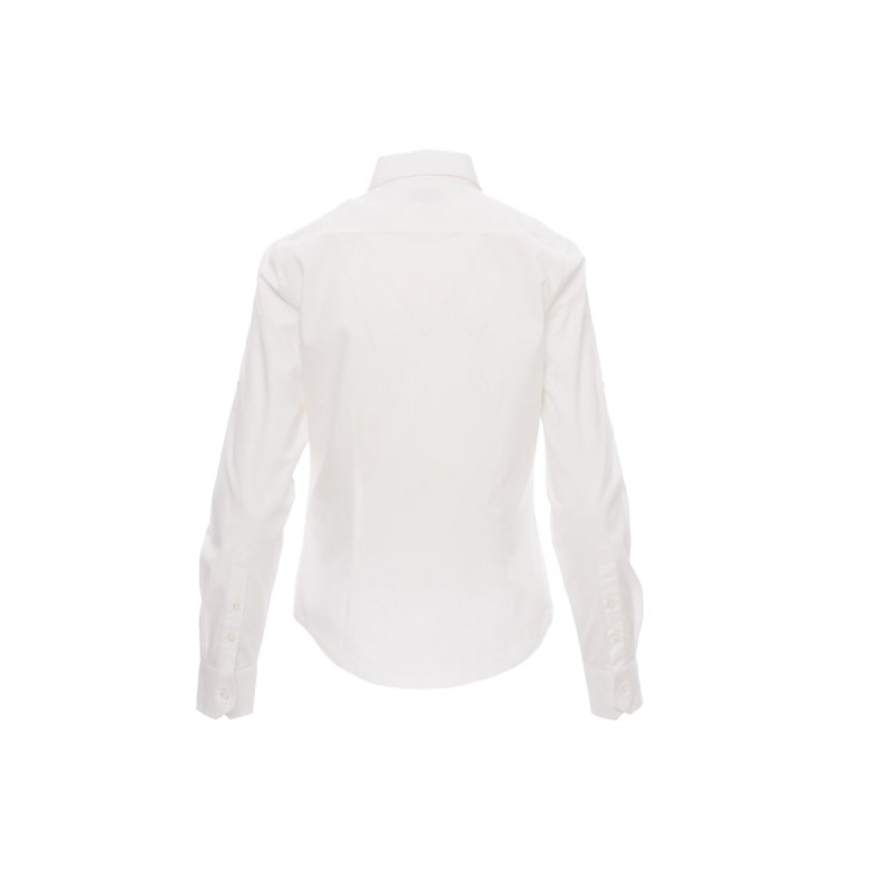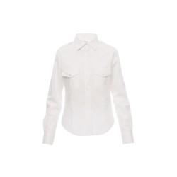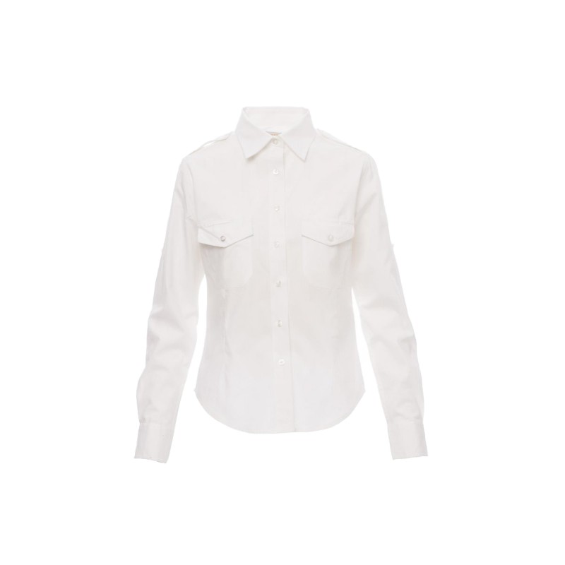 Chemise femme, fil de coton peigné très fin, coupe légèrement cintrée, empiècement droit devant, fermeture par boutons assortis avec boutonnières contrastées, épaulettes, deux poches sur la poitrine avec rabat et porte-stylo . Patte avec bouton sur le bras pour retrousser facilement les manches. La chemise blanche n'a pas de boutonnières contrastées ni d'empiècement devant. Tissu traité Easy Care.