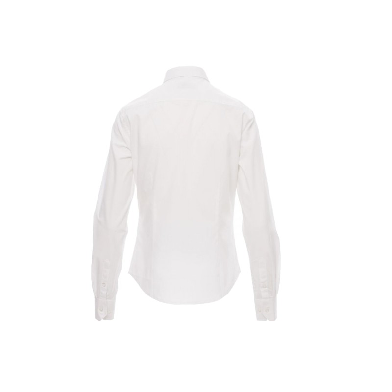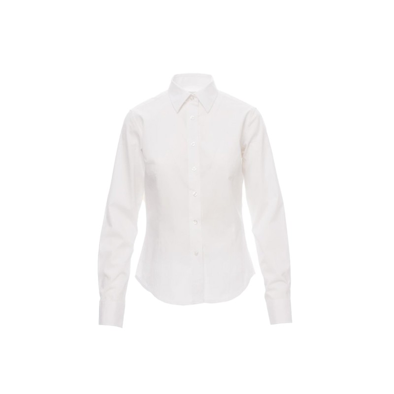 Chemise femme, fil de coton peigné très fin, coupe cintrée, pinces de reprise devant et derrière, col italien, poignets profilés avec deux boutons et une boutonnière, patte de boutonnage visible et boutons teinte assortie . Empiècement dans le dos. Tissu traité Easy Care.